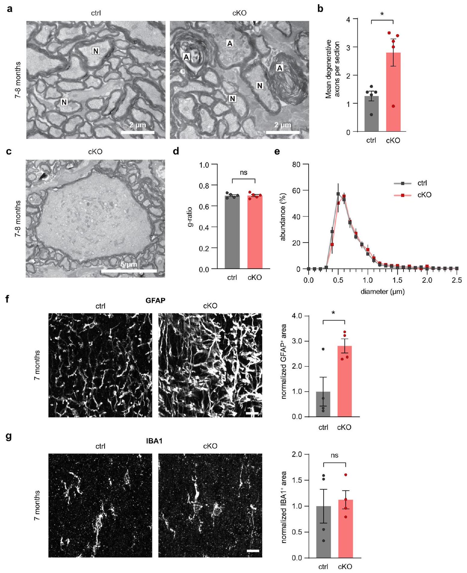 sheath thickness ( g -ratio) between genotypes ( mice; , two-sided Student’s t-test). e, Similar axon size distribution of myelinated axons ( mice; , two-way ANOVA).f, Significant increase in GFAP-immunopositive area, indicative of astrogliosis, in optic nerves from cKO mice compared to ctrl at 7 months of age ( mice; , two-sided Student’s t-test). Scalebar , No significant differences in IBA1-immunopositive area between genotypes ( mice; , two-sided Student’s t-test). Scalebar . Data are represented as means SEM.
