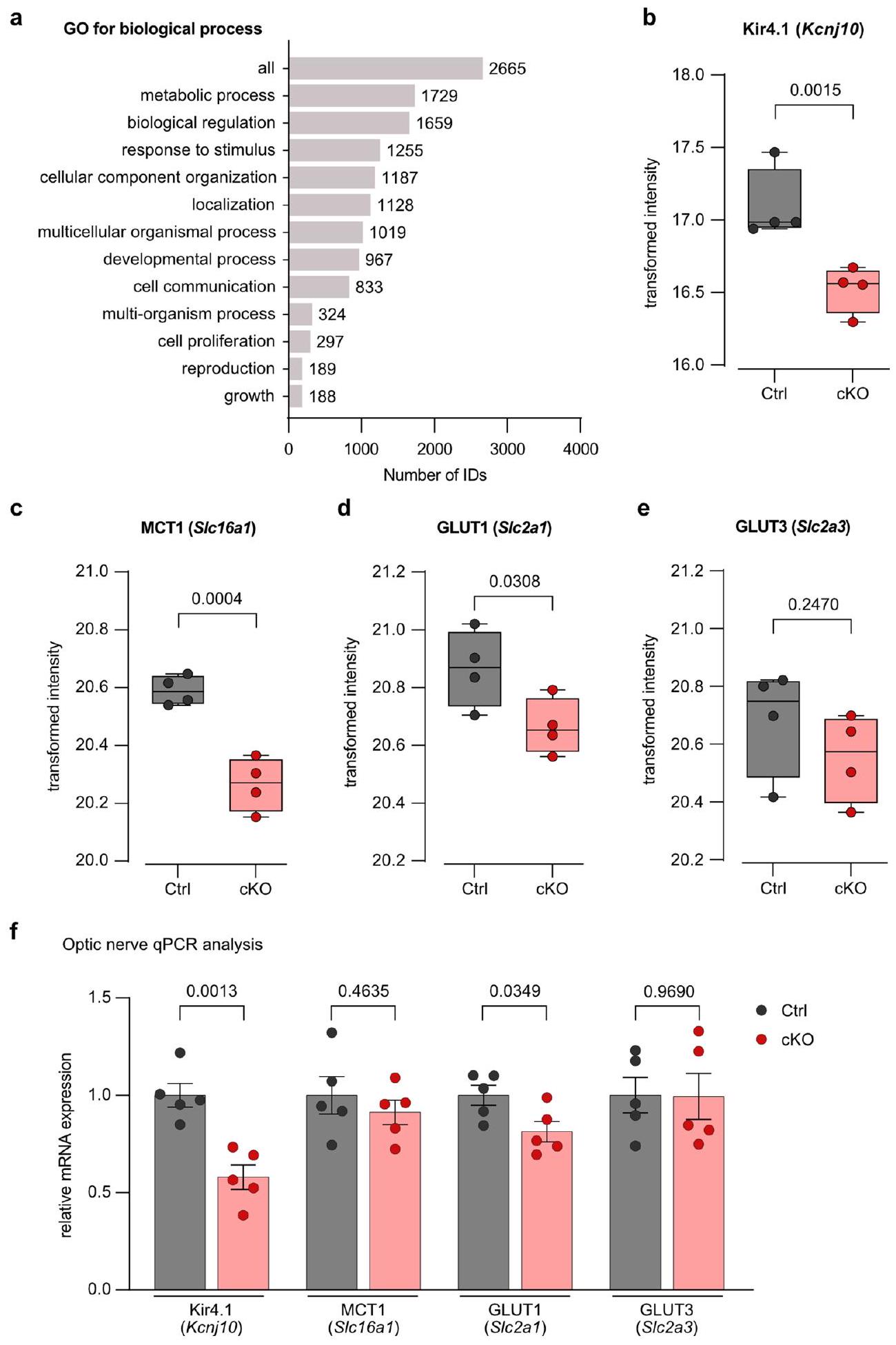 Extended Data Fig. 9|Proteomics and qPCR analysis of optic nerve lysates from young Kir4.1 cKO mice. a, Of the detected protein hits from the TMT-based proteomics analysis (see Fig. 4), 2665 were unambiguously mapped to unique Entrez gene IDs. Using the GO term biological process, bar charts depict the GO annotation and functional categorization of identified proteins. WebGestalt.org provided the summary. b, Protein abundance of Kir4.1 (gene Kcnj10) is reduced in samples from cKO ( mice) compared to , p = 0.0015, moderated t-test). c, Abundance of MCT1 (Slc16a1) is reduced in cKO compared to , moderated t -test). , Abundance of GLUT1 (Slc2a1) is reduced in cKO compared to , moderated