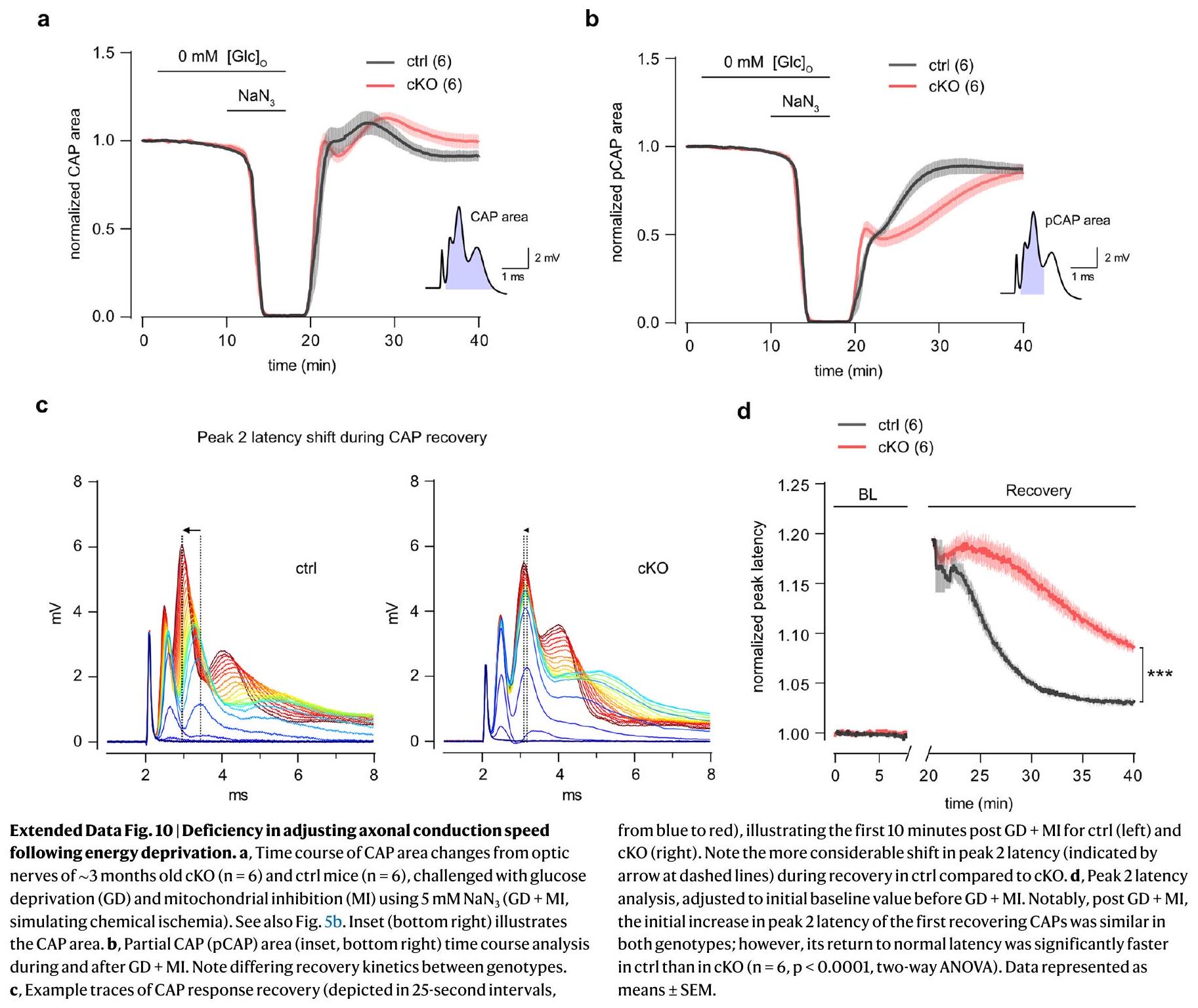 النقص الطفيف في استعادة ATP دفعنا إلى فحص استعادة إطلاق المحاور في الفئران المعدلة وراثيًا بشكل أعمق. الانخفاض السريع في مساحة CAP بعد GD + MI، كان حظر التوصيل المحوري مشابهًا بين الأنماط الجينية، وبدت بداية واستعادة حركية إطلاق المحاور غير متغيرة (الشكل البياني الممتد 10a). تحليل مساحة CAP الجزئي (pCAP)، الذي يعكس ديناميات ذروتي CAP الأولى والثانيةأظهرت معدلات الانخفاض المماثلة عند GD + MI، في حين اختلفت ديناميات تعافي pCAP بين الأنماط الجينية (الشكل البياني الممتد 10b). كشفت الفحص الدقيق لموجات CAP عن اختلاف ملحوظ في حركيات التعافي لزمن الذروة (الشكل البياني الممتد 10c). في الضوابط، زادت سعة ذروة CAP تدريجياً مع الذروة