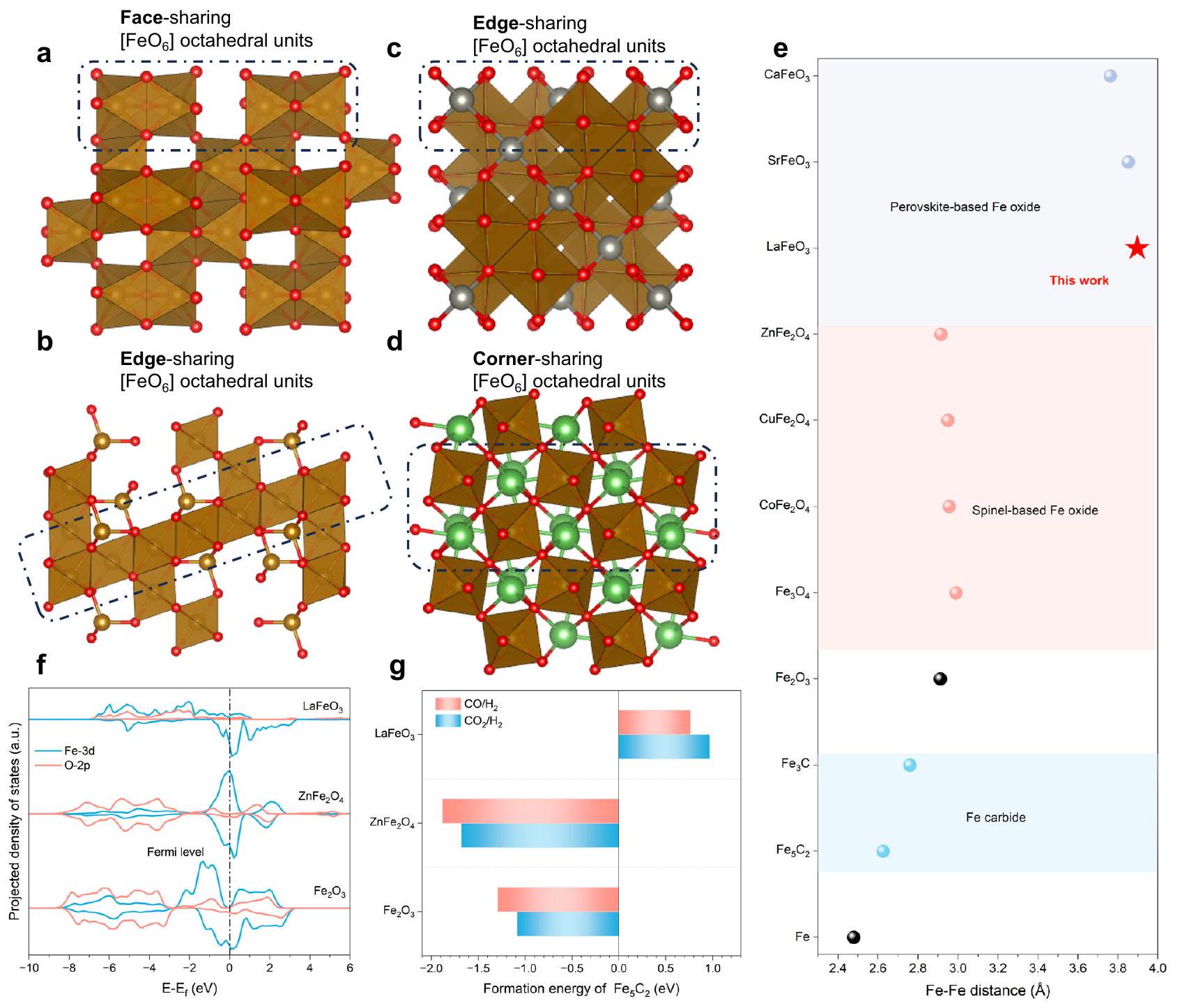 الشكل 1 | تصميمالبيروفسكايت كأكسيد قائم على الحديد مقاوم للتCarbonization. نموذج الهيكل الذري لـ (أ)، (ب) ، (ج) ، و (د) ، موضحًا أوضاع الاتصال المختلفة لـالأوكتاهدرا. الكرات باللون الأحمر والبني والفضي والأخضر تمثل، وذرات لا، على التوالي. e مسافاتالكربيدات، ومختلف أكاسيد الحديد.الكثافة المتوقعة للحالات (PDOSs) لـ، و تم حساب طاقات التكوين لكل مولمن خلال تقليل و عن الأجواء التفاعلية النموذجية.