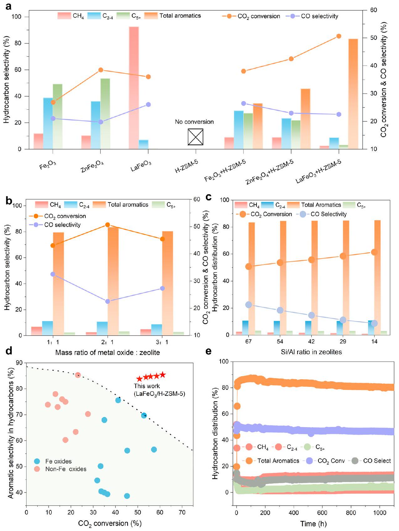 مقارنة بين (نجمة حمراء) وذكرت المحفزات غير الحديدية (دائرة وردية) والحديدية (دائرة زرقاء) فيما يتعلق باختيار العطرية في الهيدروكربونات والتحويل. الخط المنقط الأسود هو دليل للعين. البيانات المعروضة فيتم الحصول عليه تحتبسرعة فضائية قدرهافيتقييم الاستقرار التحفيزي لـمحفز مع ظروف تفاعل أكثر صرامة بسرعة فضاء تبلغفي، و . تصل الانتقائية في جميع الهيدروكربونات إلىبينما يتكون كل من ثلاثي ميثيل البنزين وأربعة ميثيل البنزين، وهما مضافان مرغوب فيهما ذوا قيمة حرارية عالية في وقود الطائرات، من تقريباًمن إجمالي العطريات (الشكل 2 أ والشكل التكميلي 10). بالإضافة إلى ذلك،نسبة التحويل تظهر زيادة حادة منإلى. هذا يعني أن H-ZSM-5 يمكنه استخدام بعض الوسائط بكفاءة على طول المسار البطيء مسارات الهدرجة على الحالة النقية. يشير إلى أن الأروماة لمثل هذه الوسائط في المسام الحمضية لـ H-ZSM5 قد تكون أسرع من الهيدروجين العميق نحو على أسطح الأكسيدأثرتمت دراسة نسبة الكتلة لـ H-ZSM-5 بشكل أعمق (الشكل 2ب). تم اعتماد نسبة كتلة معتدلة منيؤدي إلى مثاليتحويل وانتقائية العطور. إن زيادة أو تقليل نسبة الكتلة يؤدي كلاهما إلى تدهور غير مرغوب فيه في أداء التحفيز، والذي يُعزى إلى عدم توازن الهدرجة ومعدلات الاقتران على أكسيد المكمل ومجالات الزيوليت.