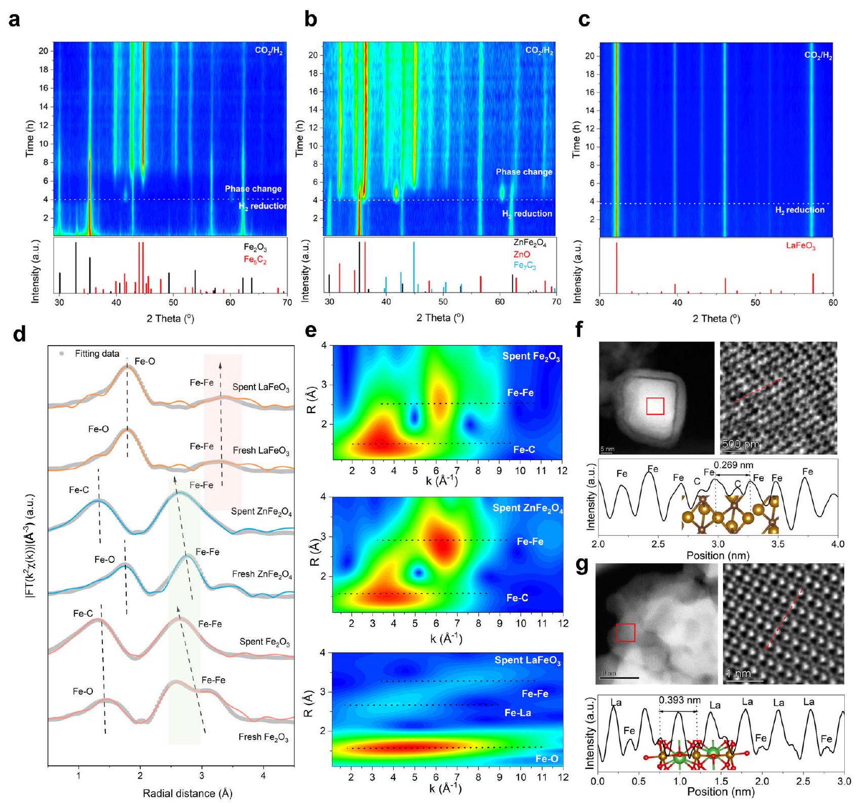 Lastly, high-resolution electron microscopy was carried out to reveal the morphological evolution of spent Fe oxide catalysts. For the spent , a large quantity of were detected with carboninterstitial aggregated Fe , showing a short distance of 0.269 nm (Fig. 3f); while is shown to retain the particulate morphology with negligible particle size variation, as well as the fine perovskite structure with an alternate La and Fe arrangement (Fig. 3g). Intensity profiles of the iDPC-STEM images along imaginary line depict the preservation of long distance ( 0.393 nm ) and the existence of (Supplementary Fig. 20). All above in situ and ex situ diffraction, spectroscopic, and microscopic results validate the superior structural stability and high carburization resistance of perovskite in reactive atmosphere, thereby substantiating the rationality of our structural design and theoretical prediction that a long distance and electronic structure modulation through La pillaring can effectively suppress Fe migration.
