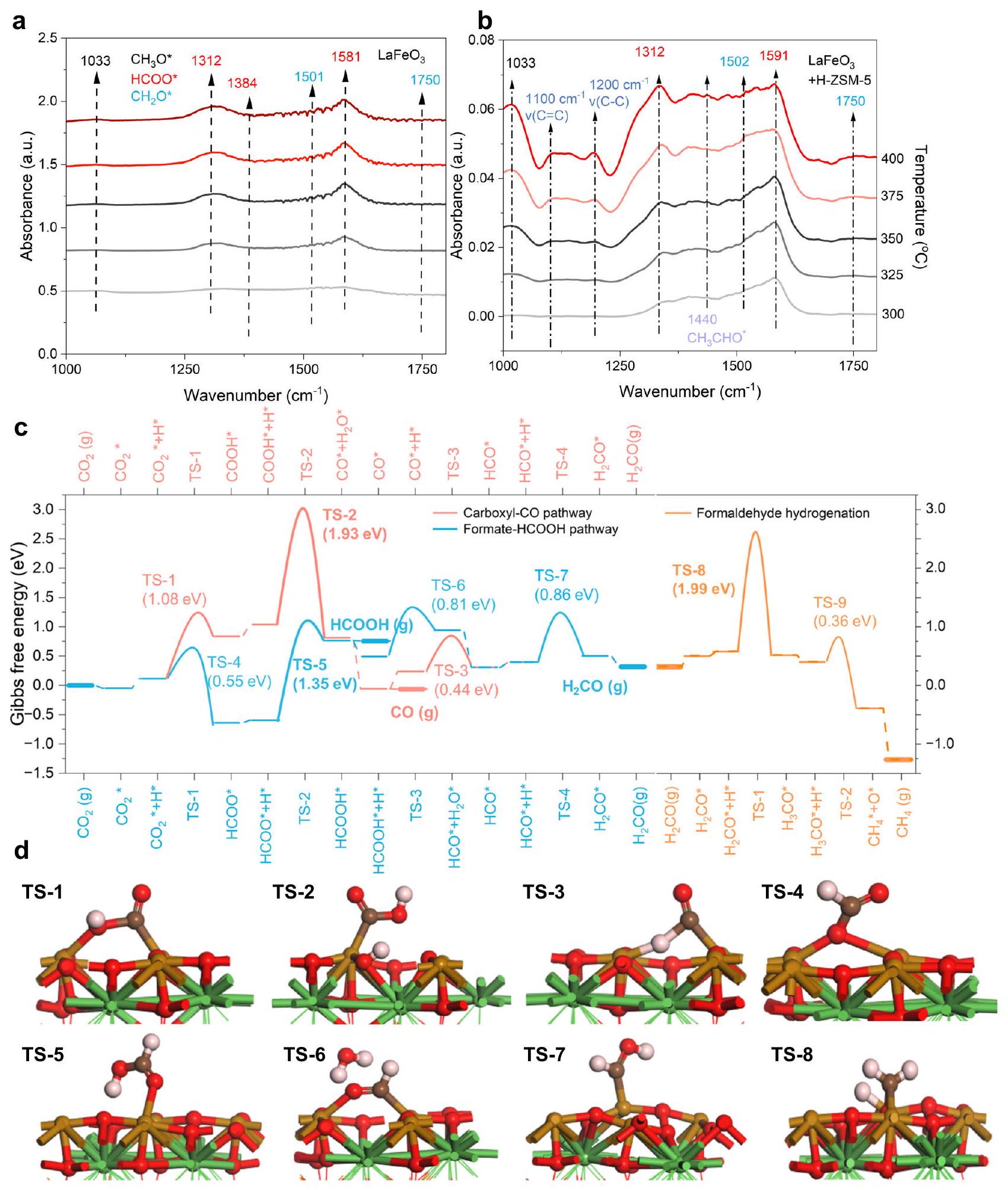 مُميز بخطوط أفقية عريضة. يمكن توضيح المنافسة بين إزالة الجزيئات والهيدروجين الإضافي في الحالات التي يكون فيها HCOOH الغازي ويُفترض أن تكون المواد المتفاعلة للهيدروجين اللاحق. هيكل حالات الانتقال d TS فوقخلالإلىالكرات باللون الأسود والأحمر والبني والأخضر تمثلوذرات اللانثانوم، على التوالي. مقيد بالخطوة الثانية من الهيدروجين، التي يجب أن تتجاوز حاجز تنشيط قدره 1.93 إلكترون فولت (TS-2) و1.35 إلكترون فولت (TS-5) لإنتاج و على التوالي. لذلك، فإن مسار الفورمات أكثر وصولاً من الناحية الحركية من مسار الكربوكسيل على يحتوي على (220)، وهو ما يتماشى مع الإشارات القوية لـ HCOO* (الموجودة حصريًا في مسار الفورمات) في قياسات DRIFTS في الموقع. مسار ثانوي يبدأ من الفورمات، وهو ما يسمى تتم الهدرجة عبر أكسيد الفورمالديهايد (تمت أيضًا دراسة ( ) ولكن هناك حاجز عالٍ يبلغ 2.02 إلكترون فولت (الشكل التكميلي 29).
