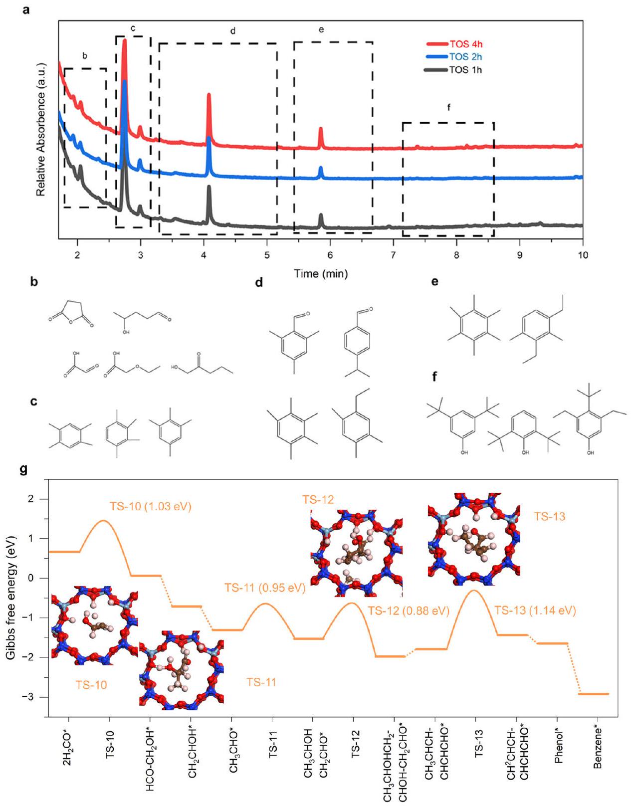 To substantiate as pivotal intermediates in this tandem catalysis, we further explored the aldol-aromatic reaction within H-ZSM-5 ( . One experimental procedure developed by the previous method has been carried out to detect the species inside zeolite during different time on stream (TOS). It can be found that some of aldol condensates, aromatic aldehydes and phenols-type aromatics along with multi-methylbenzene (Fig. 5a-f). The decrease of aldol condensates from 1 h to 4 h demonstrates that aldol reaction plays a significant role in the initial induction period. In addition, evidence shows that aromatic aldehydes, phenols also exhibit considerable amounts in the TOS of 1 h and 2 h in induction, indicating the feasibility for the transformation of aldol condensates into aromatic aldehydes and some phenolic oxygenates, which shows that a reaction pathway of aldol-aromatic as we speculated. Besides, the detailed reaction route was also considered by using DFT calculation inside H -ZSM-5. As delineated in Fig. 5g, h, we assumed that species rapidly diffused into H-ZSM-5, instigating a series of transformations into aldol condensates. Specifically, two molecules initially adsorb near the Al-OH site, initiating the first coupling. This process results in the formation of species (also observed in Fig. 4b), which then enters the aldol reaction, facilitating further coupling until long-chain six-carbon oxygenates are formed. Subsequently, these undergo cyclization and aromatization, a process influenced by the confinement and acidic properties of H-ZSM-5, ultimately leading to the formation of benzene (Supplementary Fig. 31). From a thermodynamic perspective, the energy profile within H-ZSM-5 is significantly lower than that of the species on the surface. This observation indicates that the zeolite effectively alters the reaction pathway from to a more desirable Aromatics sequence. Such computational insights coherently align with our experimental results, offering a robust rationale for the observed transformation pathway and underscoring the crucial role of as intermediates in this sophisticated tandem catalysis process.