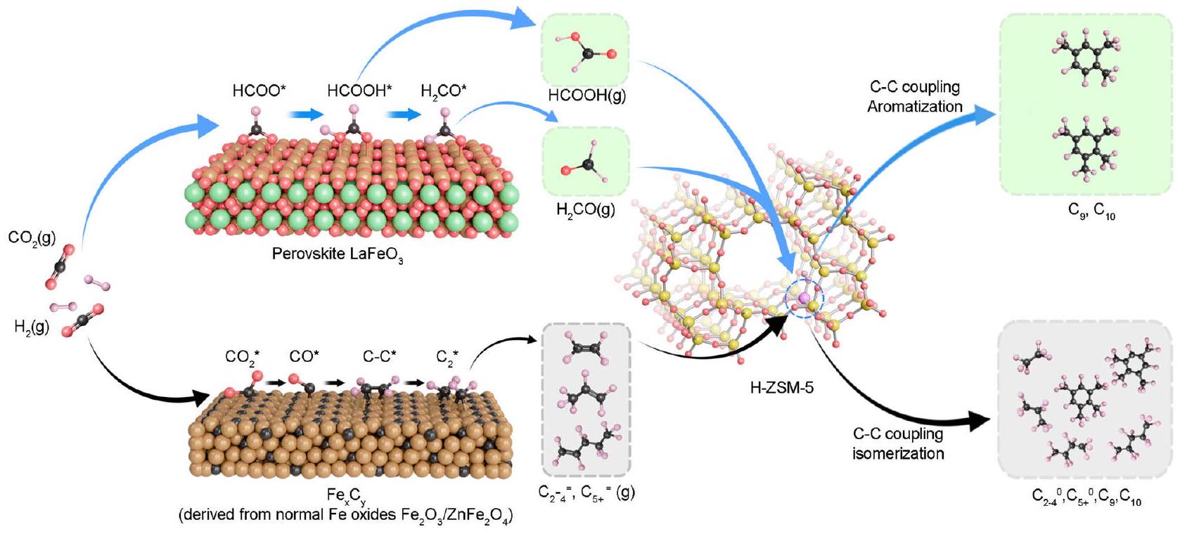 On the contrary, Fe-based catalysts have been widely reported with superior activity for hydrogenation to aromatics ; but in general, also suffer from undesirable selectivity when combined with H-ZSM-5. This process was also called enhanced Fischer-Tropsch route. To be more specific, light olefins ( ) were produced over iron-based oxides domain with a selectivity at the range of . Such intermediates diffuse into zeolite to open C-C coupling and cyclization reaction to produce aromatics . However, this composite route encompasses a complex reaction network: hydrogenation and uncontrolled coupling occur on the iron oxide, while further coupling takes place inside the zeolite. This complexity often results in mismatched coupling rates between oxide and zeolite and unintended isomerization of olefins within the zeolite channels. As a result, Fe oxides have seldom achieved satisfactory selectivity for aromatics among hydrocarbons ( in this composite catalyzed tandem conversion of . While extremely precise control strategies like the introduction of an appropriate amount of alkali metal, as illustrated by Sun et al. , have shown to improve selectivity, they introduce a new challenge: alkali metals tend to migrate to the zeolite, diminishing catalytic performance over time . To circumvent these issues, disentangling the hydrogenation domain from the coupling domain in the tandem system may be another potential strategy for Iron-based catalyst. In other words, by maintaining robust hydrogenation activity while tempering the coupling propensity on the iron oxide side, may offer great potential for highly efficient directional tandem conversion of to aromatics .