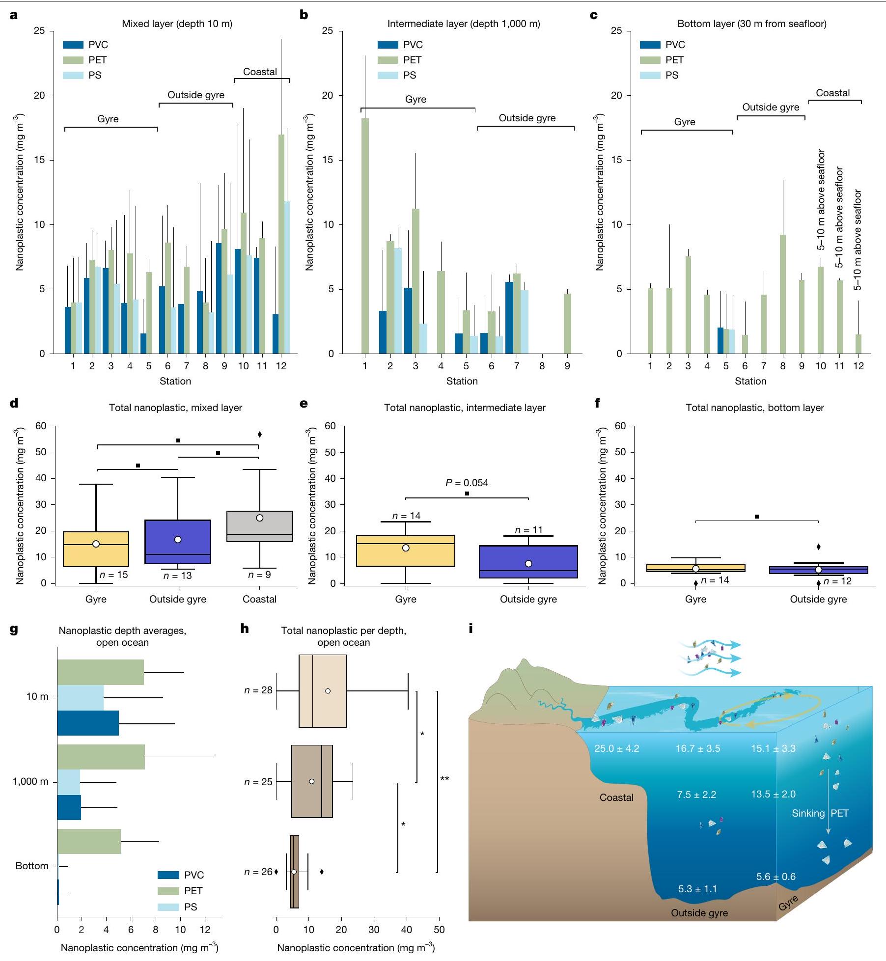 تلوث البلاستيك في المجال البحري منتشر على نطاق واسع، حيث تم توجيه معظم الاهتمام العلمي إلى البلاستيك الكبير والبلاستيك الدقيق.. بالمقابل، النانو بلاستيك في المحيطات (تظل غير محددة إلى حد كبير، مما يترك فجوات في فهمنا لميزانية الكتلة لهذه الفئة من البلاستيك. هنا نقيس تركيزات النانو بلاستيك على نطاق حوض المحيط على طول مقطع عرضي يعبر شمال المحيط الأطلسي من الدوامة شبه الاستوائية إلى الرف الأوروبي الشمالي. نجد تقريبًا من جزيئات البلاستيك النانوية من البولي إيثيلين تيريفثاليت (PET) والبولي ستيرين (PS) والبولي فينيل كلوريد (PVC) في عمود الماء بأكمله. في المتوسط، نلاحظ تركيزًا أعلى بمقدار 1.4 مرة من الجزيئات البلاستيكية النانوية في الطبقة المختلطة مقارنةً بعمق المياه المتوسطة، مع أعلى تركيزات للجزيئات البلاستيكية النانوية في الطبقة المختلطة بالقرب من القارة الأوروبية. تركيزات الجزيئات البلاستيكية النانوية في عمق المياه المتوسطة أعلى بمقدار 1.8 مرة في الدوامة شبه الاستوائية مقارنةً بالمحيط الأطلسي المفتوح خارج الدوامة. أدنى تركيزات للجزيئات البلاستيكية النانوية، بحواليفي المتوسط، وتتكون بشكل أساسي من PET، توجد في المياه القاعية. بالنسبة للطبقة المختلطة من شمال المحيط الأطلسي المعتدل إلى شبه الاستوائي، نقدر أن كتلة النانو بلاستيك قد تصل إلى 27 مليون طن. هذا في نفس النطاق أو يتجاوز التقديرات السابقة لميزانية البلاستيك الكبير/البلاستيك الصغير لكامل المحيط الأطلسي.أو المحيط العالميتشير نتائجنا إلى أن النانو بلاستيك يشكل النسبة السائدة من تلوث البلاستيك البحري.