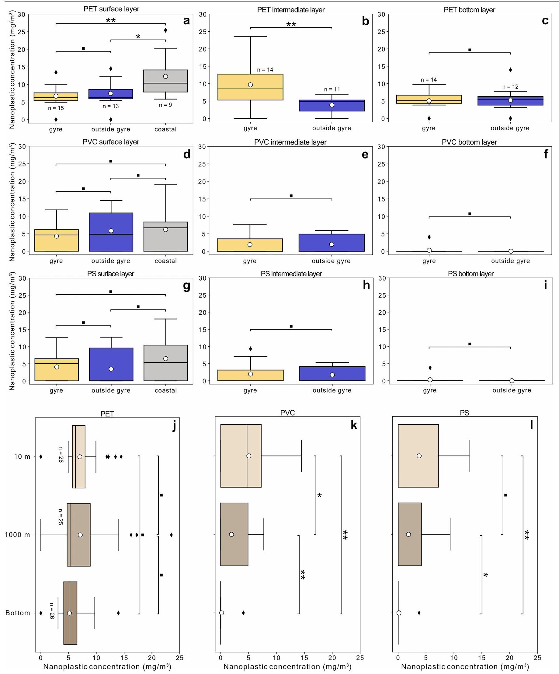 Extended Data Fig. 1| Box plots of nanoplastic polymer distribution in the water column of the North Atlantic. Average nanoplastic concentrations of PVC, PET and PS for the groups (‘gyre’; stations 1-5), the open ocean between the shelf and the gyre (‘outside gyre’; stations 6-9) and at the shelf break or on the European shelf (‘coastal’; stations 10-12) (a-i) and for the mixed layer , intermediate layer and bottom layer above the seafloor) for the offshore stations (stations 1-9) (j-1). The boxes indicate the percentiles of the median, with the whiskers extending to the data points that fall within the 1.5 interquartiles. Data points that fall outside this range are indicated by a diamond. The mean value is indicated with the white dot. Differences between groups were analysed using a one-way ANOVA test and a -test for means comparison. Significance levels with -values (**), -value and -value are indicated.