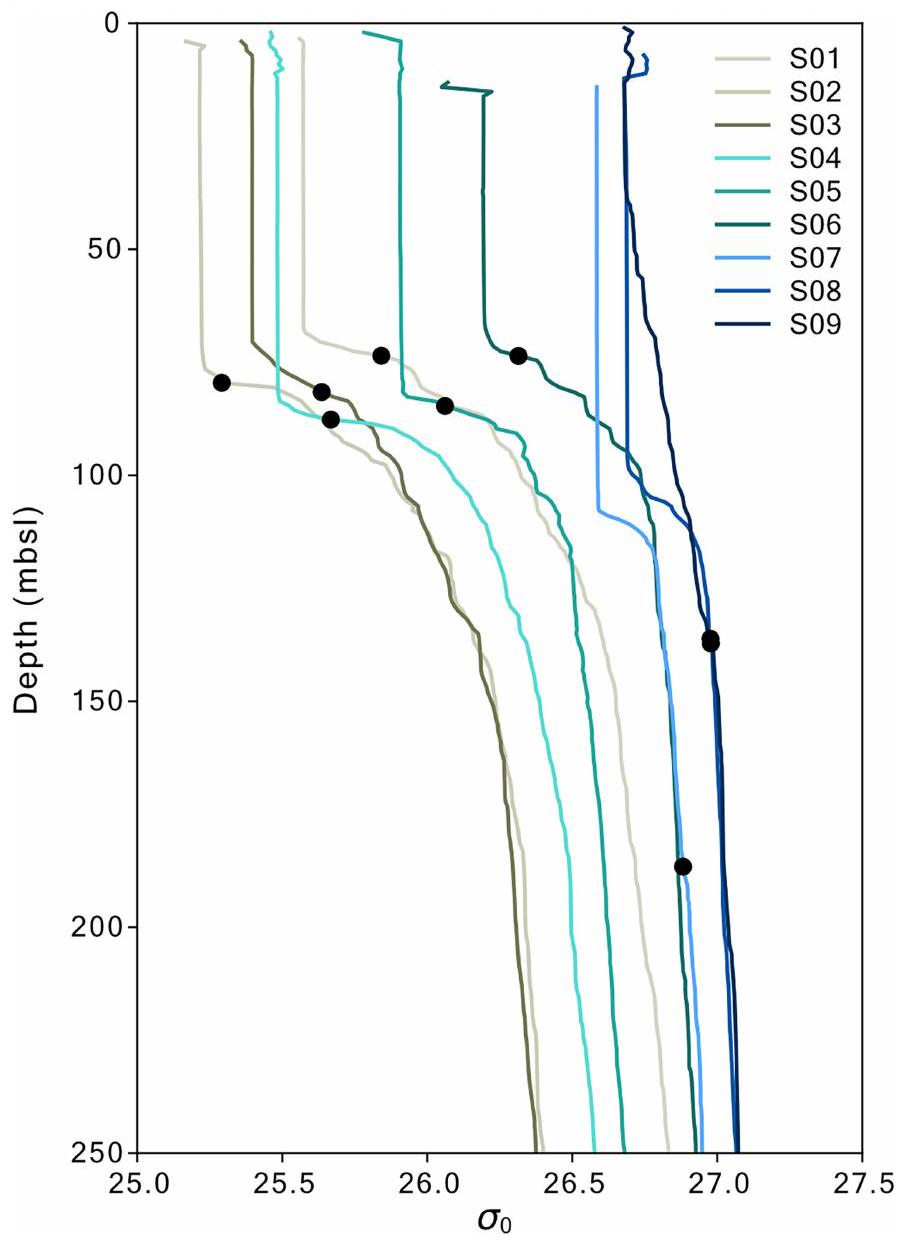 Extended Data Fig. 2 | Surface-referenced potential density profiles of the upper 250 m at the offshore stations (stations 1-9). Calculated mixed-layer depth for each offshore station is indicated with a black dot. Data were obtained with a CTD sensor.