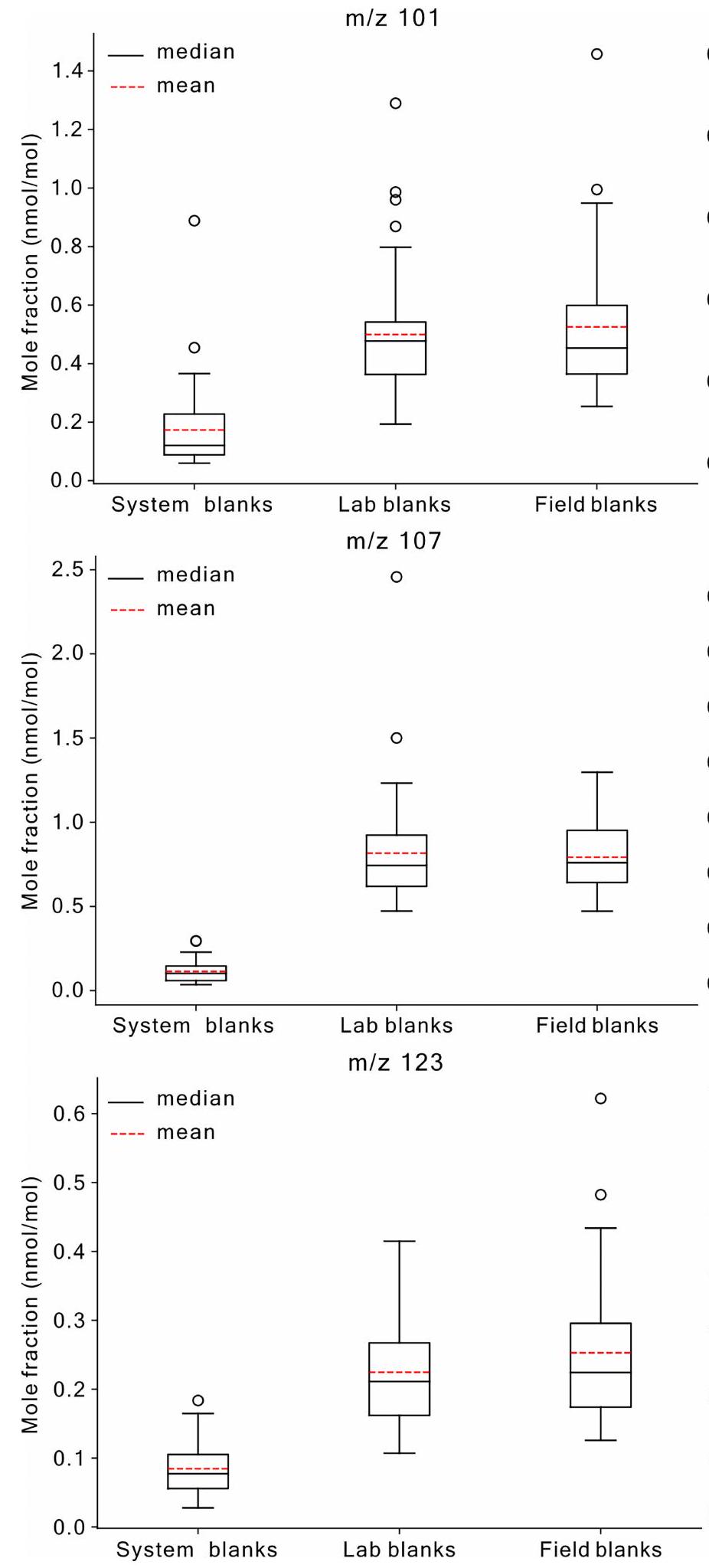 Extended Data Fig. 3 | Mole fractions of the system, lab and field blanks for six masses that are associated with the presence of plastics. The boxes indicate the percentiles of the median, with the whiskers extending to the data points that fall within the 1.5 interquartiles. Data points that fall outside this range are indicated by a circle. The mean value is indicated with the red