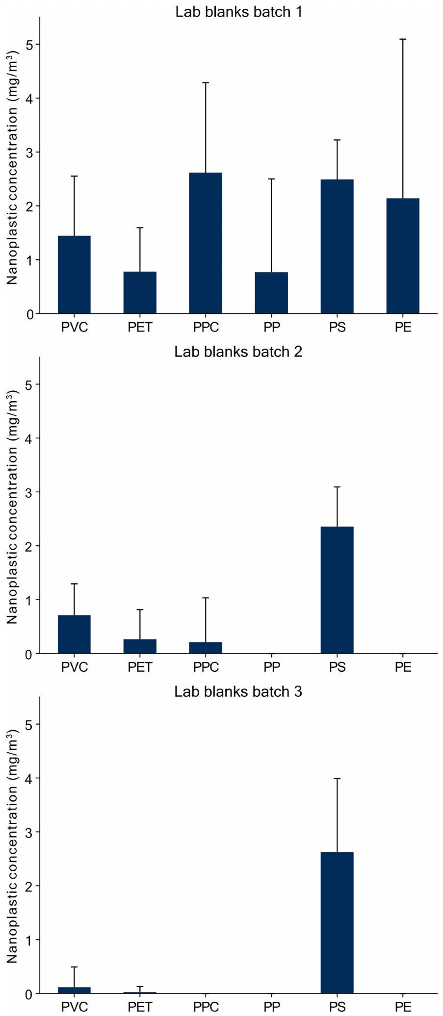 blanks. The error bars represent the s.d. of the blanks in each batch. All lab blank batches were found to have consistently low average PE, PET, PPC, PP, PS and PE nanoplastic concentrations . After background subtraction, composed of the mean of the lab blanks of the corresponding batch, still considerable amounts of nanoplastic could be detected in the ocean-water samples. We acknowledge, nonetheless, that the presence of background nanoplastic, although in low amounts, results in further uncertainty of nanoplastic concentrations. Negligible amounts of PET were detected in the lab blanks performed during the measurements of the bottom-water samples (see ‘batch 3’), implying that the considerable amounts of PET nanoplastic detected at several kilometres depth are not a result of procedural contamination. However, up to of PS has been observed in some of the lab blanks.