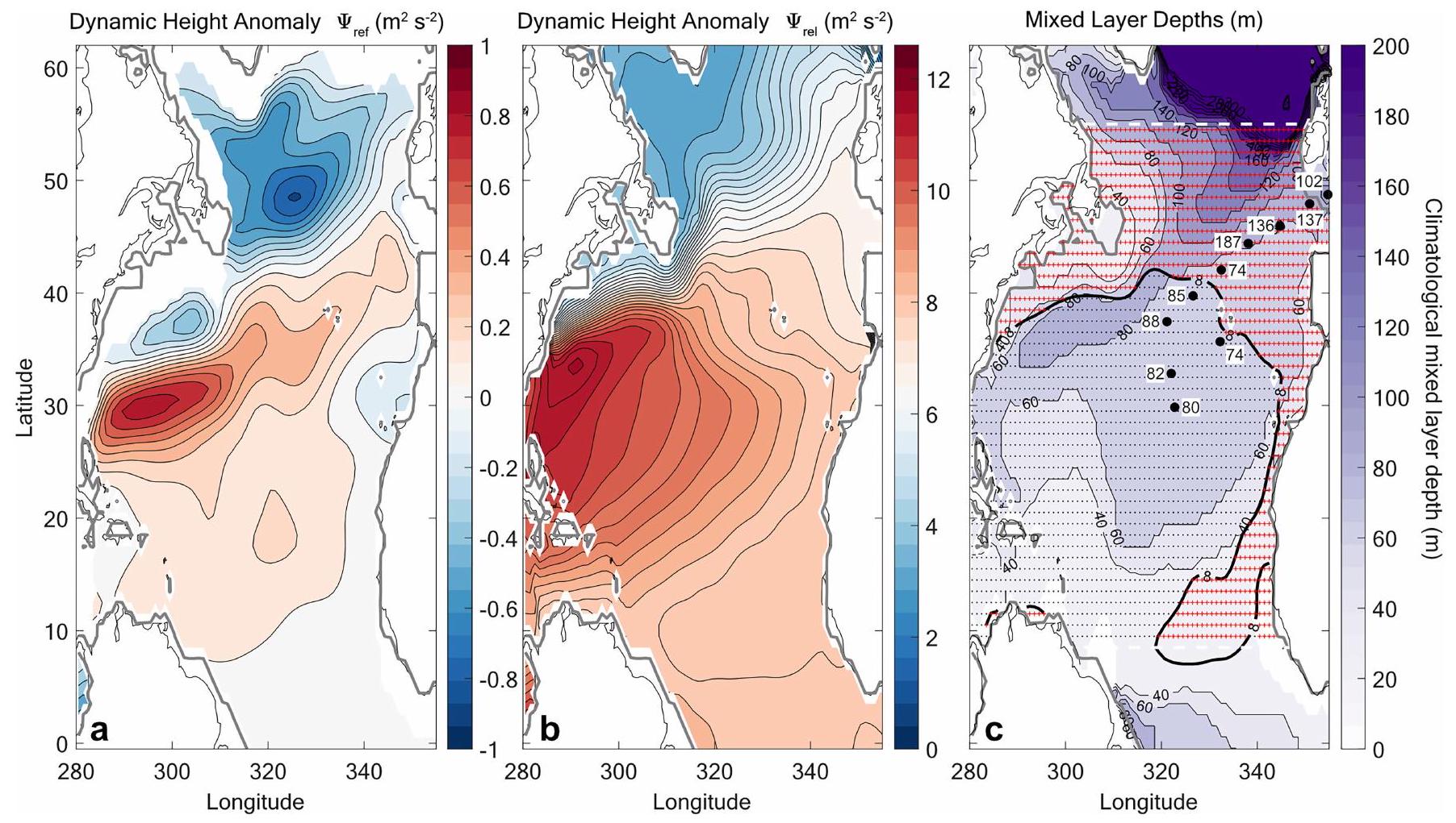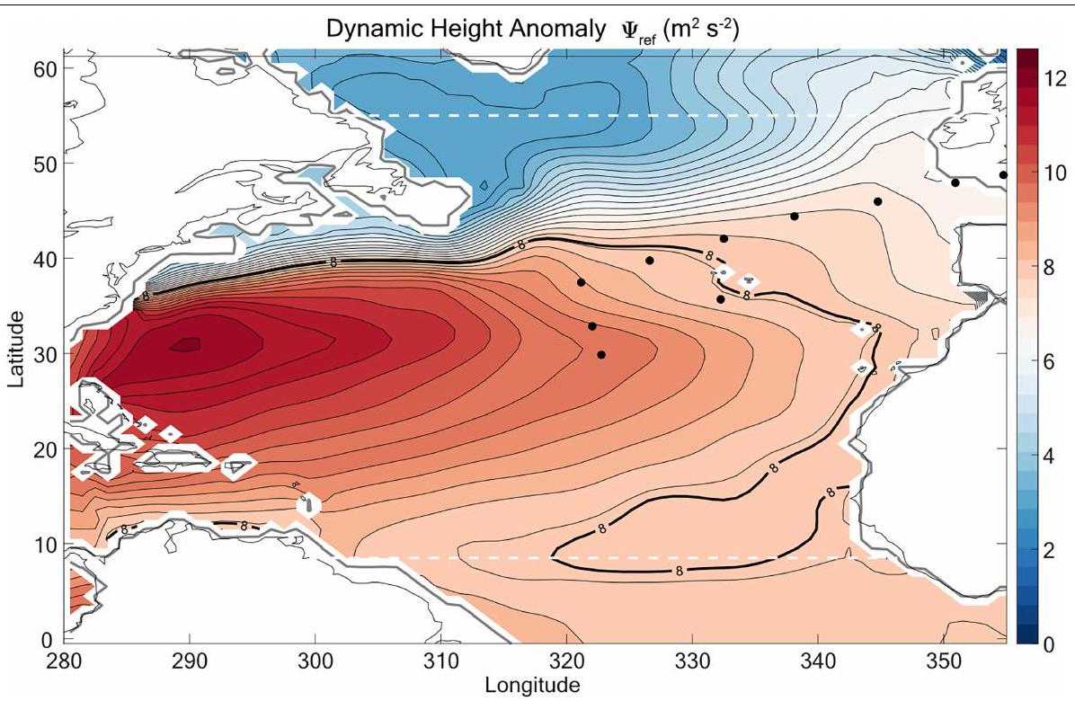 To define the NASG, we first considered that the gyre is mostly concentrated in the upper 400 m (Fig. 1 in ref. 68). On the basis of the World Ocean Atlas vertical grid sizes, we averaged over the upper 410 m . The resulting streamlines of the DHA (Extended Data Fig. 6) correspond well to model-based Lagrangian trajectories (Figs. 1d and 3 in ref. 68) and stream function (Fig. 1 in ref. 69). This supports that