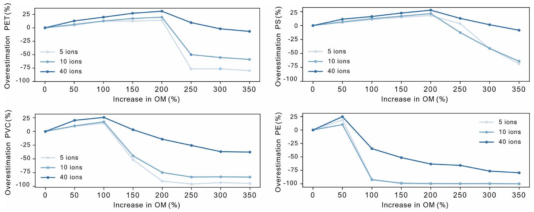 من ناحية أخرى، أظهر تحليل مونت كارلو أن التقدير المفرط في جميع السيناريوهات (مستويات مختلفة من الشوائب العضوية الموزعة على أعداد مختلفة من الأيونات) لجميع البوليمرات البلاستيكية لم يتجاوز. على سبيل المثال، بالنسبة لـ PET، عند زيادة الخلفية العضوية بمقدار أو من إشارة البوليمر، كان التقدير المفرط حوالي، حوالي (ذروة) وحوالي، على التوالي (الشكل البياني الممتد 7). بعبارة أخرى، إذا كانت العينة تحتوي على كمية كبيرة من المادة العضوية الطبيعية، فمن المحتمل أن يفشل التعرف على البلاستيك (مطابقة بصمة) قبل أن يتم تقدير كمية النانو بلاستيك بشكل مفرط بـ. وبالتالي، نعتبر نتائجنا محافظة، مع تقدير مفرط محتمل يبلغ حوالي بسبب تأثيرات المصفوفة العضوية.
