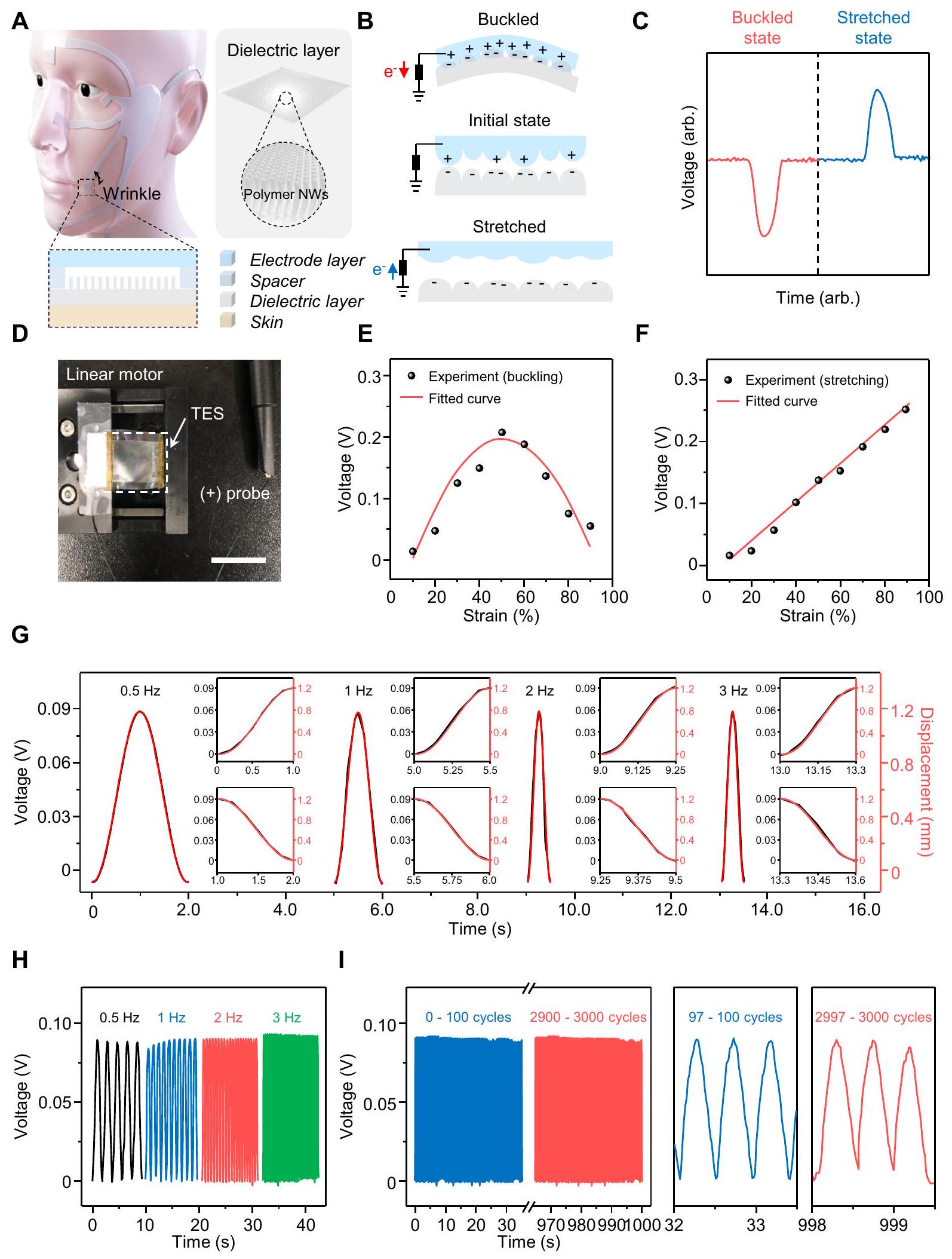 إجهاد جلد الوجه أثناء التعبير الوجه وضمان متانة وحدة الاستشعار. كما هو موضح بشكل تخطيطي في الشكل 2B، يتراكم جهد كهربائي بسبب الفرق بين سلسلة الكهرباء الساكنة بناءً على اختلاف الألفة للإلكترونات، حيث لعب PDMS مادة سلبية كهربائيًا عن طريق استلام الإلكترونات ولعب الإلكترود القابل للتمدد القائم على PEDOT:PSS مادة إيجابية كهربائيًا عن طريق التبرع بالإلكترونات في TES. بالإضافة إلى ذلك، تجعل وحدة استشعار الإجهاد لدينا منطقة الاتصال تتغير عند التمدد وتحقق حتى حالات انثناء بحيث يمكنها اكتشاف حركة الإجهاد ثنائية الاتجاه بين مستشعرات الإجهاد المعتمدة على الكهرباء الساكنة للمرة الأولى، حسب علمنا. وبالمثل، تم عرض الإشارات الناتجة من وحدة استشعار الإجهاد لدينا خلال دورة الانثناء والتمدد في الشكل 2C. تم توضيح الآلية الشاملة لعمل مستشعر الإجهاد ثنائي الاتجاه لكل وضع في الشكل التكميلي 5.
