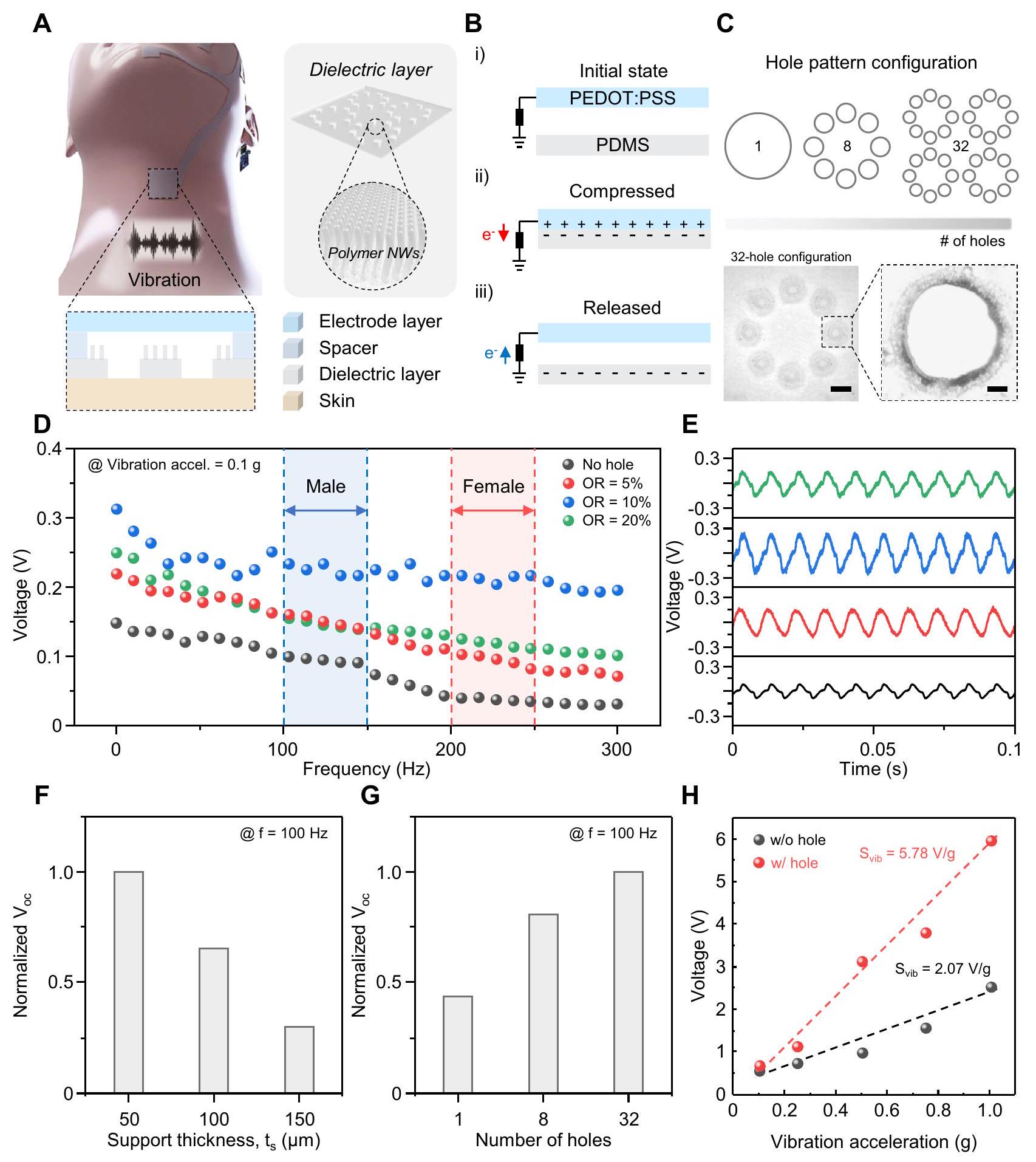 information to the circuit system. As shown in Fig. 3A, the vocal sensing unit was fabricated with the holes patterned PDMS as dielectric layer and PEDOT:PSS embedded PDMS as an electrode layer to make TES. The holes were introduced into the vocal sensing unit as acoustic holes which not only act as communicating vessels to ventilate an air between two contact surfaces to the ambient air, which results in enhanced flat frequency response but also reduce the stiffness by improving the movement of the rim of diaphragms