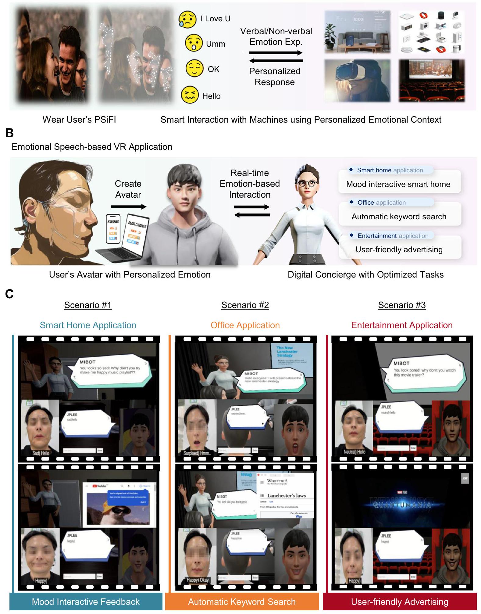 of external factors such as time, place, and obstacles. Furthermore, we realized wireless data communication for real-time human emotion recognition with the help of designed data-processing circuit unit and the rapid adapting learning model and achieved acceptable standard in terms of test accuracy even with the barrier such as mask. Finally, we first demonstrated digital concierge application in VR environment capable of responding to user’s intention based on the user’s emotional speech information. We believe that the PSiFI could assist and accelerate the active usage of emotions for digital transformation in the near future.