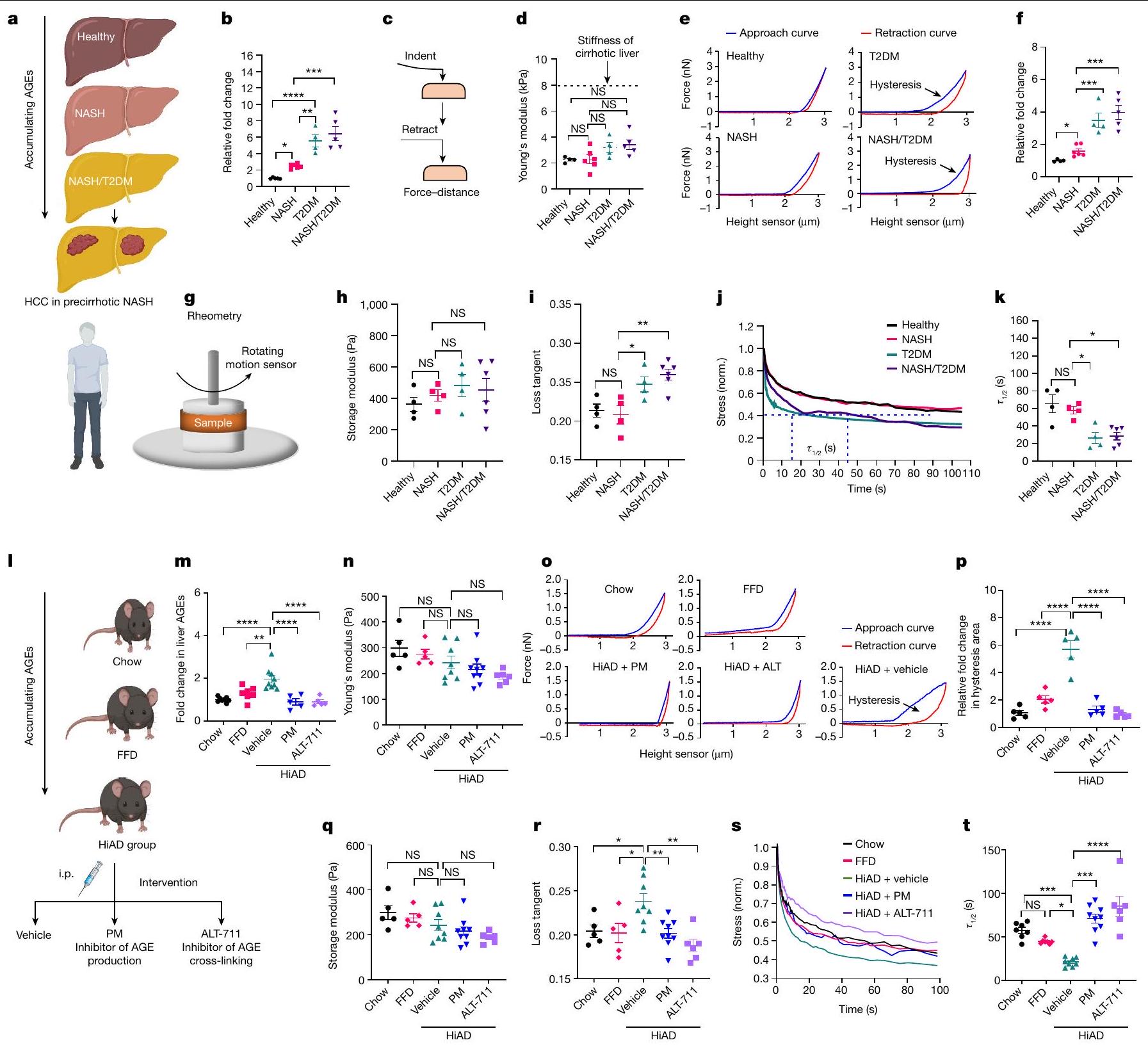 لدراسة العلاقة بين المنتجات النهائية للجليكشن (AGEs) واللزوجة المرنة، قمنا بدراسة نموذج فأر تم تغذيته بنظام غذائي عالي المحتوى من AGEs (HiAD). تظهر هذه الفئران تدهور الدهون، وتورم خلايا الكبد، ومقاومة الأنسولين، ومستويات أعلى من AGEs في الكبد. مقارنةً مع أولئك الذين يتبعون نظامًا غذائيًا عاديًا (تشاو) أو نظامًا غذائيًا للوجبات السريعة (FFD) (الشكل 11، م). استنادًا إلى تحليلات AFM (الشكل 1ن-ب) والريومترية (الشكل 1ق-ط)، كانت الصلابة مشابهة (الشكل 1ن، ق)، لكن اللزوجة المرنة زادت (الشكل 1ع، ب، ر-ط)، في الفئران التي تناولت نظام غذائي عالي الدهون مقارنة بتلك التي تناولت طعامًا عاديًا أو نظام غذائي غني بالدهون. من الجدير بالذكر أن تثبيط إنتاج AGEs باستخدام البيريدوكسامين (PM) أو منع تكوين روابط AGE-collagen المتقاطعة باستخدام الألاجبرين (ALT-711) عكس التغيرات في اللزوجة المرنة (الشكل 1ع، ب، ر-ط). معًا، تشير هذه البيانات إلى أن AGEs في ECM ما قبل التليف تسبب زيادة في اللزوجة المرنة.