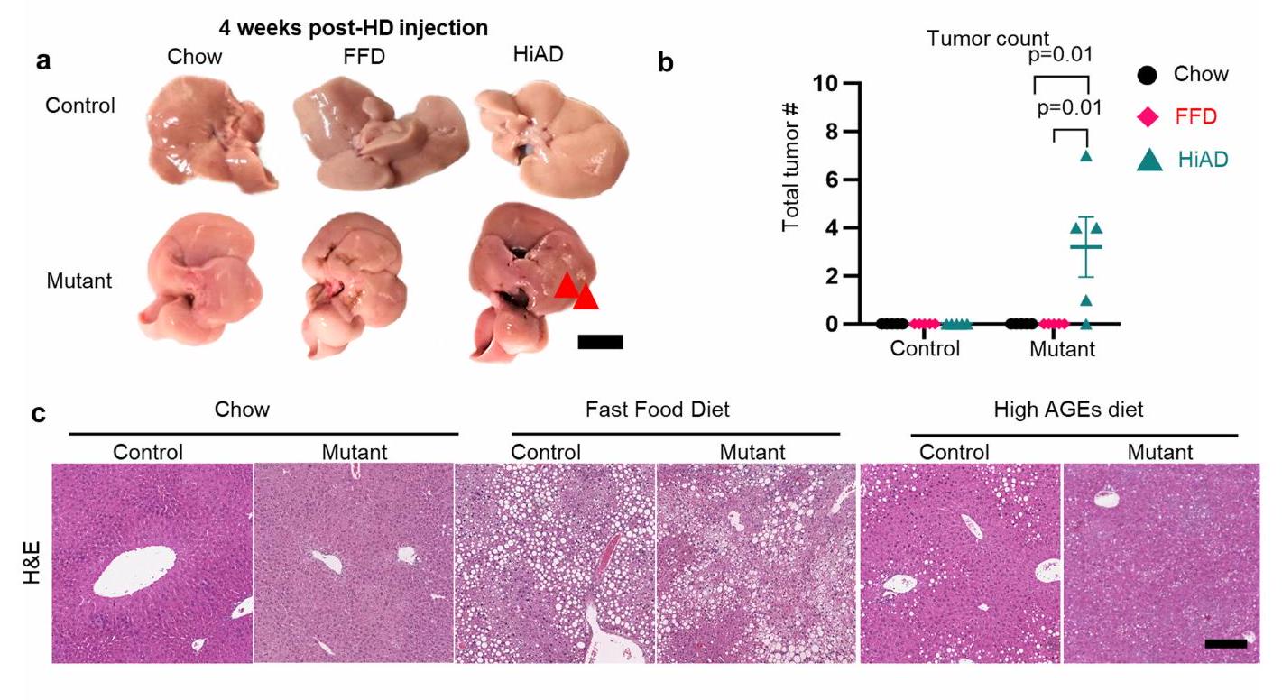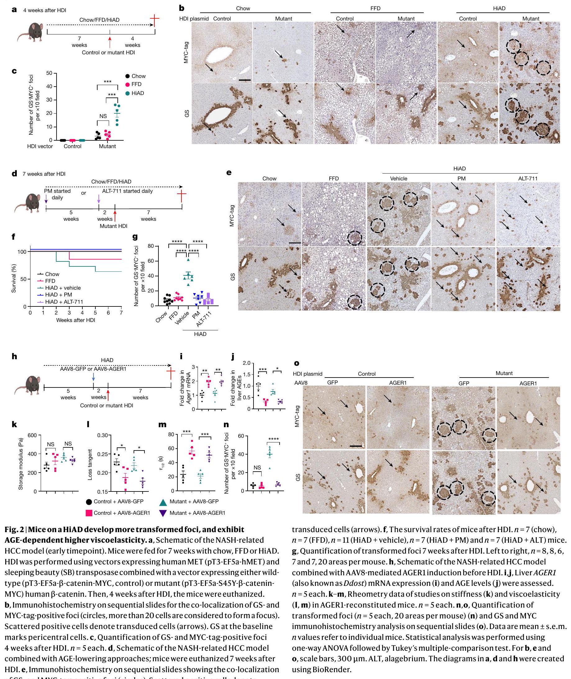 النتائج المذكورة أعلاه دفعتنا للتحقيق في الروابط السببية المحتملة بين لزوجة ECM وتقدم سرطان الكبد hepatocellular carcinoma (HCC). الدراسات المتعلقة بسرطان الكبد المرتبط بـ NASH عادة ما استخدمت نظامًا غذائيًا عالي الدهون مع مادة مسرطنة مثل ثنائي إيثيل نيتروسامين، أو نماذج معدلة وراثيًا، أو نظام غذائي CDAA.. ومع ذلك، من المهم اتباع المسار المرضي النموذجي الذي يتميز بإصابة الخلايا والالتهاب الذي يسبق. لتقليد الظروف تجريبيًا مع زيادة استرخاء إجهاد ECM قبل ظهور HCC، استخدمنا نموذجًا أكثر ملاءمة لتعديل البيئة الأيضية/المصفوفة قبل زراعة الورم. قمنا بتوصيل MET البشري (hMET) هيدروديناميكيًا مع الطفرة-كاتينأو التحكم في المتجهات لتغذية الفئران على نظام الشو-، FFD- أو HiAD. لوحظ ظهور مبكر ونمو أسرع للبؤر المتحولة (الغلوتامين سينثيتاز (GS) وإيجابية علامة MYC) في الفئران التي تغذت على HiAD مقارنة بالفئران التي كانت على نظام الشو أو FFD (الشكل 2a-c والشكل الممتد 1a-c). من المهم أن نمو الورم تراجع، ومعدل البقاء تحسن بعد تثبيط AGE باستخدام PM أو بعد كسر روابط الكولاجين-AGE باستخدام ALT (الشكل 2d-g والشكل الممتد 1d-f).