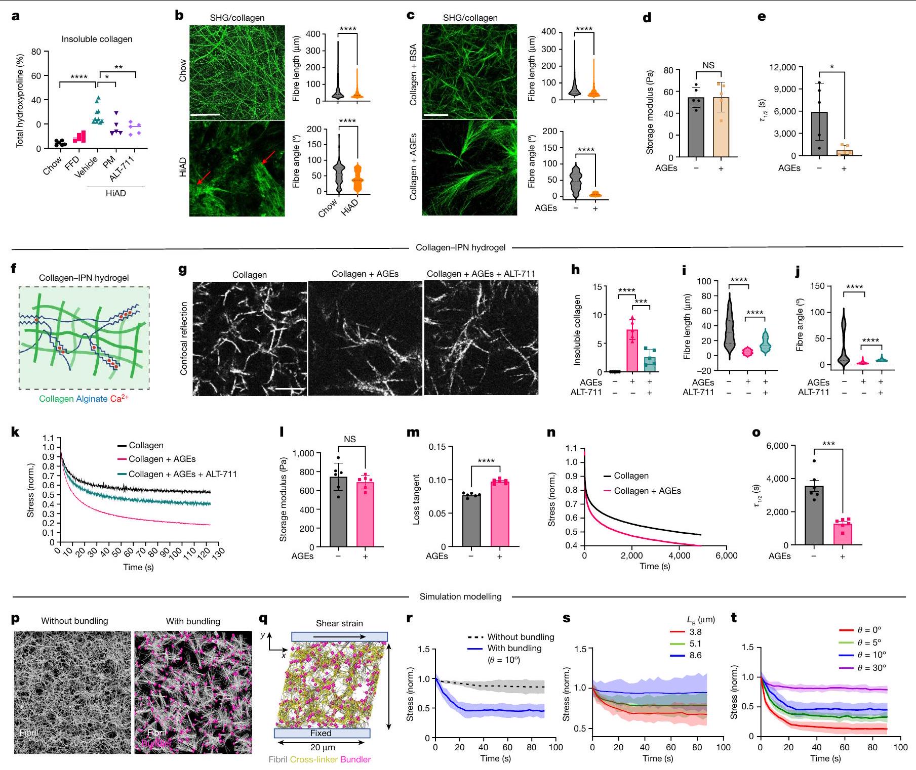 على HiAD، بينما بدت الشبكة أكثر تنظيمًا مع ألياف أرق في البشر الأصحاء، وفي الفئران التي تتبع نظام الشو أو HiAD بعد علاج PM وALT أو إعادة تكوين AGER1. أدى تثبيط إنتاج AGE أو كسر روابط AGE-كولاجين إلى تقليل كمية الكولاجين غير القابل للذوبان المرتبط بشكل كبير (الشكل 3a). قمنا بتحليل ECM الأصلي غير الخلوي من الفئران التي تتغذى على الشو أو HiAD باستخدام SHG لتقييم طول ألياف الكولاجين، الاتجاه المكاني والترابط. مقارنة بالشبكة المنظمة جيدًا في الفئران التي تتبع نظام الشو، أظهرت الفئران التي تتغذى على HiAD، الشبكة أقل ترابطًا وكان لديها حزم كولاجين بألياف أقصر وزوايا ألياف أقل (الشكل 3b). تم رؤية هياكل مماثلة بألياف أقصر وزوايا في هيدروجيل الكولاجين المعاد تكوينه المحايد مع AGEs (الشكل 3c). يمكن أن تتداخل التفاعلات بين AGEs وبقايا ليسين تيلوببتيد الكولاجين مع إطالة الألياف وتشكيل شبكة كولاجين متماسكة هيكليًا . لتقييم خصائص هيدروجيل الكولاجين المرتبط بـ AGE والعلاقة بين الشبكات ذات الاتصال المنخفض وخصائص المصفوفة، قمنا بإجراء قياسات ريوولوجية. كانت هيدروجيل الكولاجين المرتبط بـ AGE لها صلابة مماثلة (الشكل 3d) ولكن استرخاء إجهاد أسرع مقارنة بالكولاجين غير المرتبط (الشكل 3e). بعد ذلك قمنا بقياس توزيع معاملات يونغ بواسطة رسم خرائط AFM للهيدروجيل. رأينا أنه، بينما كان هناك تباين في معاملات محلية في كلا الهيدروجيل، كانت نطاقات معاملات المرونة أعلى قليلاً في حالة الكولاجين فقط (الشكل الممتد 3c,d). أظهر توزيع مناطق الهسترسيس (اللزوجة) ترددات أعلى في هيدروجيل الكولاجين المرتبط بـ AGE (الشكل الممتد 3e,f). لدراسة المصفوفة الغنية بالكولاجين بمستوى صلابة قابل للمقارنة مع الكبد، تم اختبار هيدروجيل ثلاثي الأبعاد (IPN) مصنوع من كولاجين معدل بـ AGE والجيلاتين (الشكل 3f). تم رؤية تغييرات مماثلة في الهيكلية والترابط بعد التعرض لـ AGE (الشكل 3g). أدى كسر روابط AGE-كولاجين باستخدام ALT-711 إلى تقليل كمية الكولاجين غير القابل للذوبان (الشكل 3h) وزيادة طول الألياف، وزوايا الألياف (الشكل 3i,j) وترابط الشبكة. لم يغير ALT-711 نفسه مصفوفة الكولاجين (الشكل الممتد 3g) أو خصائصه الميكانيكية (الشكل الممتد 3h-j). أظهرت اختبارات الضغط استعادة اللزوجة بعد استخدام ALT-711 (الشكل 3k). كانت هيدروجيل IPN المختلطة مع كولاجين معدل بـ AGE تظهر صلابة مماثلة (الشكل 31)، ولكن استرخاء إجهاد أسرع مقارنة بالكولاجين غير المعدل (الشكل 3m-o) بناءً على القياسات الريوولوجية.