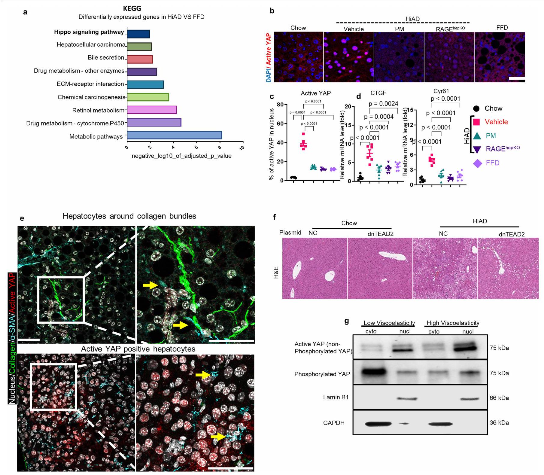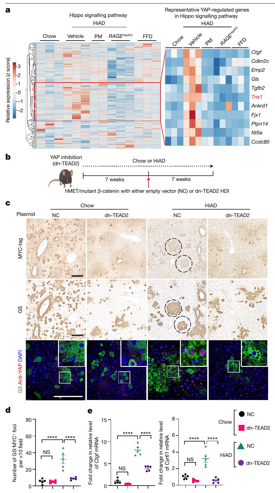 ركزنا بعد ذلك على المسارات الميكانيكية التي تؤدي إلى نمو الورم والغزو من خلال استرخاء الإجهاد الأسرع. تم إجراء تسلسل RNA (RNA-seq) وتحليلات المعلومات الحيوية على عينات كبد الفئران (في الشو، FFD، HiAD، HiAD + PM ومجموعات RAGE )، لتحديد المسارات المحتملة. تم إجراء تحليلات Kyoto Encyclopedia of Genes and Genomes (KEGG) على الجينات المعبر عنها بشكل مختلف لبؤر GS- و MYC-tag الإيجابية (دوائر). تشير الخلايا الإيجابية المتناثرة إلى بين مجموعتي HiAD و FFD لتصنيف التصنيف الوظيفي الغني (الشكل 4a والشكل الممتد 6a). في مجموعة مسار إشارة هيبو، كانت الجينات المنظمة بواسطة YAP/TAZ غنية في الفئران التي تغذت على HiAD وانخفضت بعد علاج PM وفي الفئران RAGE