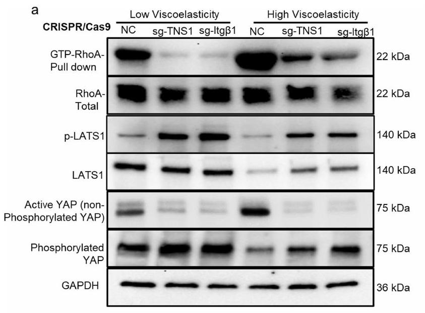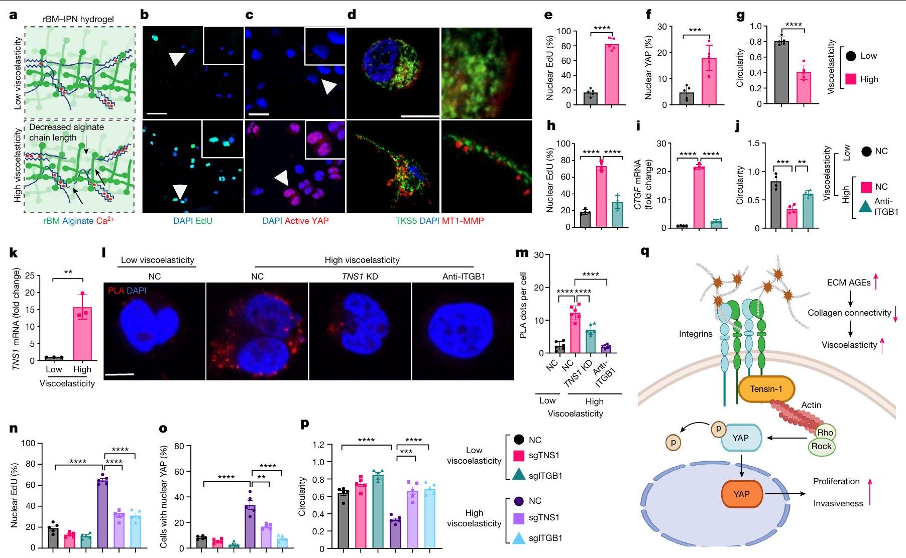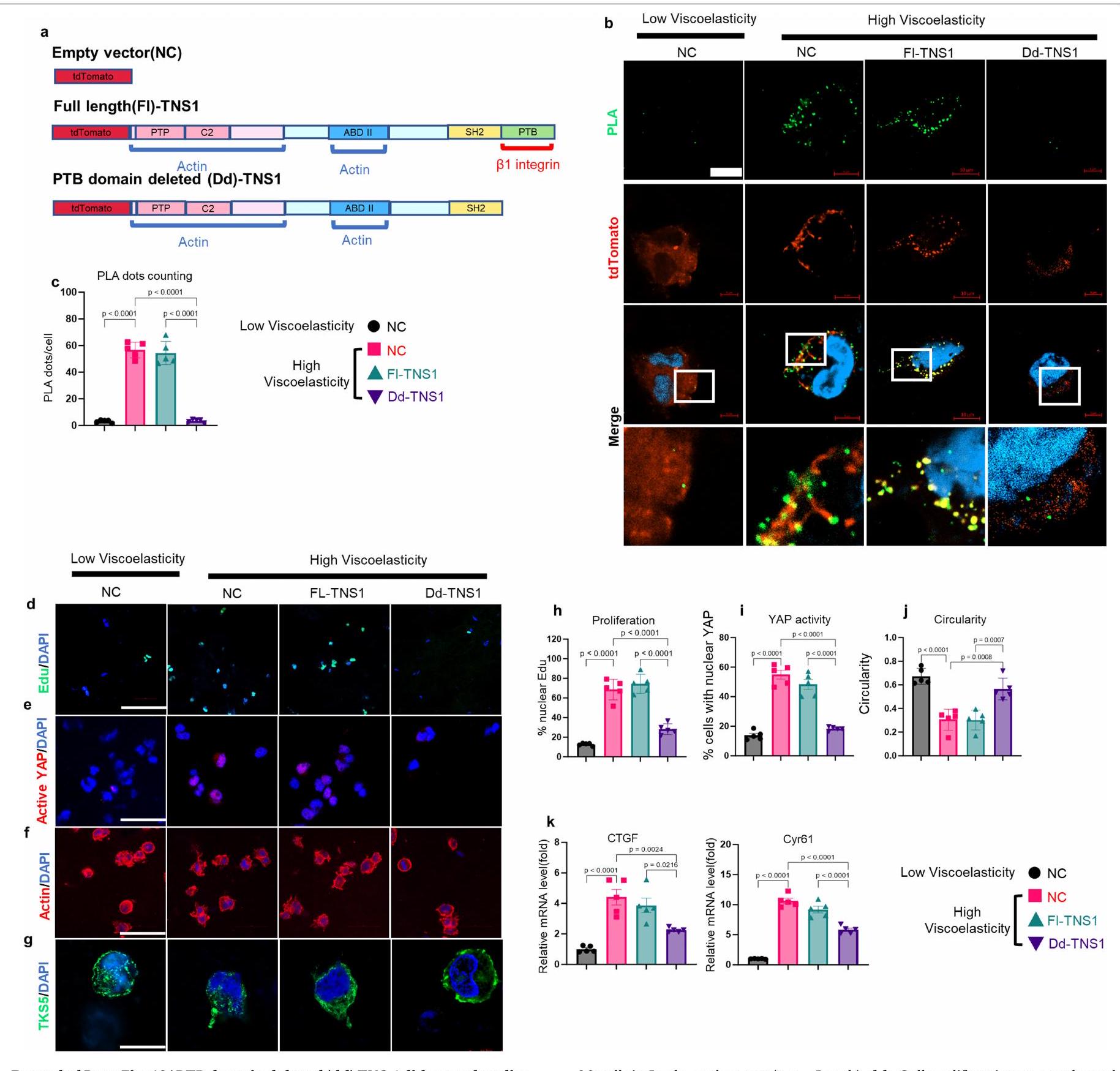 من الجدير بالذكر أنه استنادًا إلى بيانات تسلسل RNA لدينا، تم تحفيز TNS1 بشكل كبير بطريقة تعتمد على AGE واللزوجة المرنة (الأشكال 4a و5k). تم وصف TNS1 كجزء من قفل جزيئي يوسط الربط الميكانيكي بين الإنتغرينات المرتبطة بمصفوفة ECM والهيكل الخلوي الأكتين-مايوسين لتوليد قوة الجر.لدراسة الدور في إشارات الميكانيكا، تم إجراء اختبارات الربط القريب (PLA) في خلايا HCC في هيدروجيل منخفض ومرتفع اللزوجة لالتقاط التفاعل المحتمل بين TNS1 والإنتجرين.. ظروف اللزوجة العالية عززت تفاعلهم (الشكل 51، م والشكل البياني الموسع 7j (ضوابط الأجسام المضادة)). بعد ذلك، درسنا تأثيرات TNS1 أو الإنتغرينخفض (CRISPR-Cas9؛ الشكل 5n-p). وقد أدى ذلك إلى تقليل تكاثر الخلايا (الشكل 5n والشكل الإضافي 8a) بالإضافة إلى تنشيط YAP والجينات المستهدفة (الشكل 50 والشكل الإضافي 8b,e) في ECM عالي اللزوجة. تم تقليل تشكيل الغزوات، وزادت دائرية الخلايا بعد TNS1 أو الإنتغرين.إسقاط (الشكل 5p والشكل الإضافي 8c، d). أظهرت خلايا Hep3B نتائج مشابهة (الشكل الإضافي 9). لتحليل أهمية TNS1-الإنتجرين بشكل أكبرالتفاعل في تشكيل الانفادوبوديا والتكاثر، قمنا بنقل خلايا باستخدام متجه يحتوي على طفرات في TNS1 (مع حذف منطقة PTB التي تمنع ارتباطه بالإنترجرين، فيما بعد، dd-TNS1) أو TNS1 كامل الطول (الشكل التوضيحي الممتد 10a) وقمنا بإدماجها في هيدروجيلات ذات لزوجة منخفضة أو عالية. قمنا بتقييم ما إذا كان dd-TNS1 قادرًا على الارتباط بالإنتيجرين باستخدام PLA. في خلايا dd-TNS1 المعدلة، كانت إشارة PLA منخفضة جداً، بينما في خلايا full-TNS1-tdTomato الإيجابية، كانت الإشارات متزامنة (الشكل التمديدي 10b، c). كانت خلايا dd-TNS1 المعدلة في الهلامات عالية اللزوجة لديها تكاثر أقل (الشكل التمديدي 10d، h)، وانخفضت مستويات YAP النشطة وجيناته المستهدفة (الشكل التمديدي 10e، i، k)، بينما زادت دائريتها (الشكل التمديدي 10f، j) ولم تشكل بروزات (الشكل التمديدي 10g). بما أن RhoA يشارك في تنظيم شكل الخلية والهجرة، وقد وُصف أنه يتم تعديله بواسطة TNS1.، درسنا بعد ذلك نشاطه. أظهرت الخلايا في الهلاميات عالية اللزوجة زيادة في نشاط RhoA-GTPase في وجود TNS1 واندماج.-اعتمادًا على (الشكل البياني الممتد 11 أ، ب). LATS1انخفضت النشاطات وكان YAP أكثر نشاطًا في الخلايا في الجل عالي اللزوجة، في حين لوحظ العكس بعد TNS1 أو الإنتجرين.تثبيط. أدى تثبيط ROCK-GTPase والميوسين 2 إلى زيادة في دائرية الخلايا، وانخفاض في معدل التكاثر، وتقليل تعبير أهداف YAP (الشكل 11c-e من البيانات الموسعة).