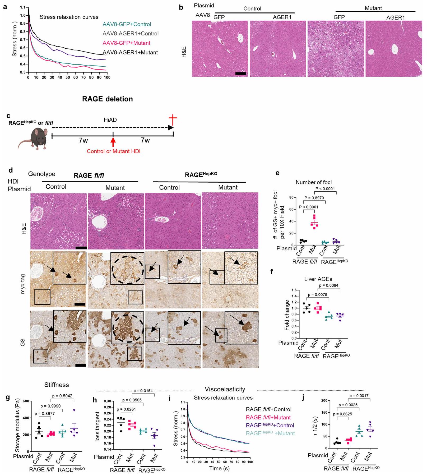 ثانيًا، درسنا الفئران التي تم حذف RAGE بشكل محدد في الكبد (المعروف أيضًا باسم Ager؛ مستقبل AGE المسبب للالتهابات؛ ) التي تم تغذيتها على HiAD، وقمنا بحقن هذه الفئران هيدروديناميكيًا بـ hMET مع طفرات -كاتينين (الشكل الممتد 2c). كانت هذه الفئران لديها نمو متقلص لبؤر الورم (الشكل الممتد 2d,e)، وانخفاض في AGEs الكبدية (الشكل الممتد 2f)، وصلابة مماثلة (الشكل الممتد 2g) وانخفاض في اللزوجة (الشكل الممتد 2h-j) مقارنة بفئران RAGE التي تغذت على HiAD.