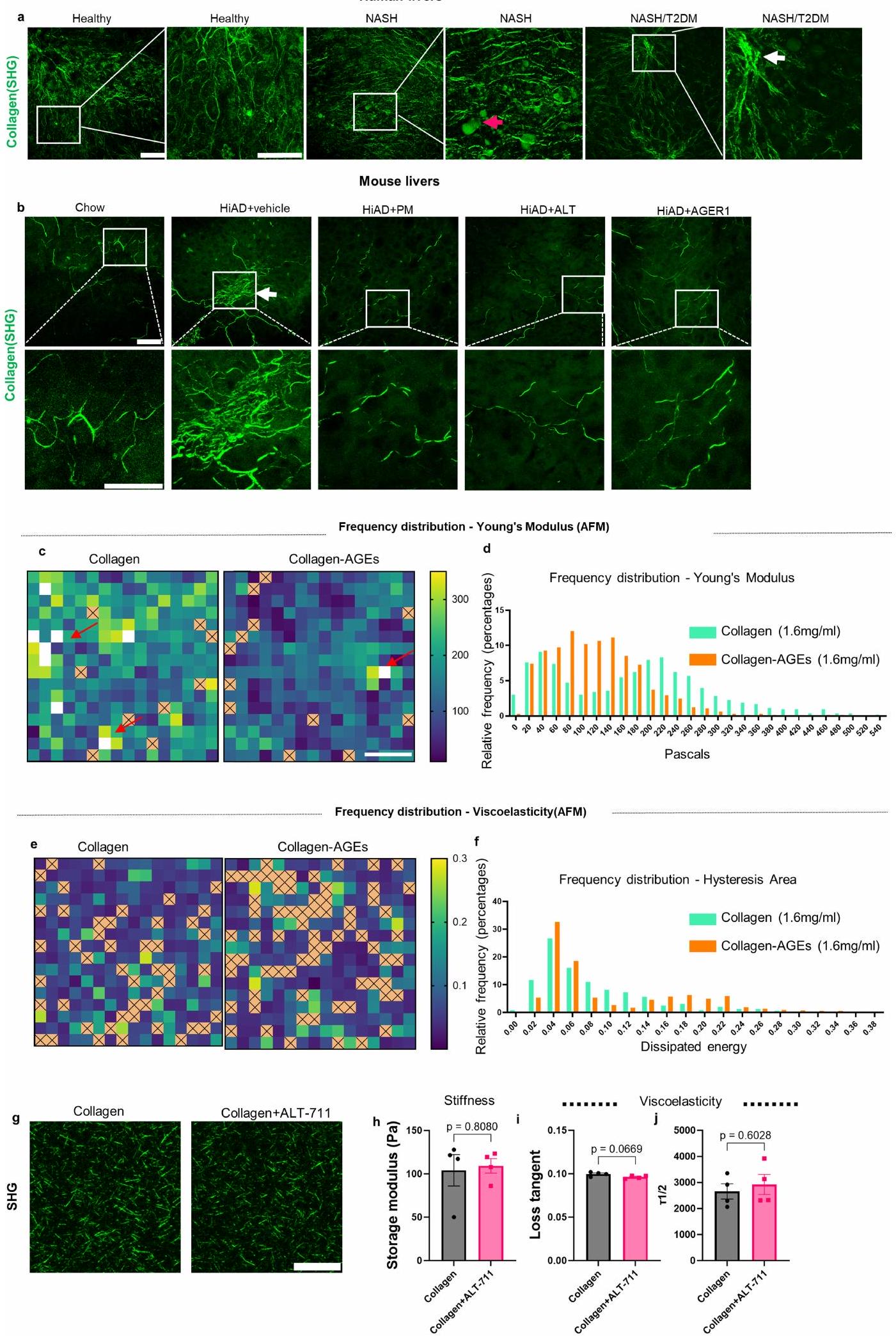 تشير البيانات المقدمة حتى الآن إلى أن تراكم AGE أمر حاسم لزيادة لزوجة ECM وتقدم HCC. بعد ذلك سعينا لتوضيح كيفية تعديل لزوجة ECM. يُعتقد أن شبكات الكولاجين من النوع 1 هي منظمين حاسمين لميكانيكا الأنسجة . يمكن أن تتداخل AGEs مباشرة مع الكولاجين وتؤثر على ميكانيكا المصفوفة عن طريق تغيير هيكلها الحلزوني . تم تصوير شبكات الكولاجين باستخدام توليد التوافقيات الثانية (SHG) مع مجهر الفوتون المزدوج في عينات كبدية من البشر (تحكم صحي، NASH، NASH + T2DM؛ الشكل الممتد 3a)، وكذلك في الفئران (الشو، HiAD، HiAD + PM، HiAD + ALT-711 وفي أكباد الفئران التي تم حقنها بـ AAV8-AGER1؛ الشكل الممتد 3b). أظهرت شبكة الكولاجين تجميعًا في المرضى الذين يعانون من T2DM + NASH وفي الفئران