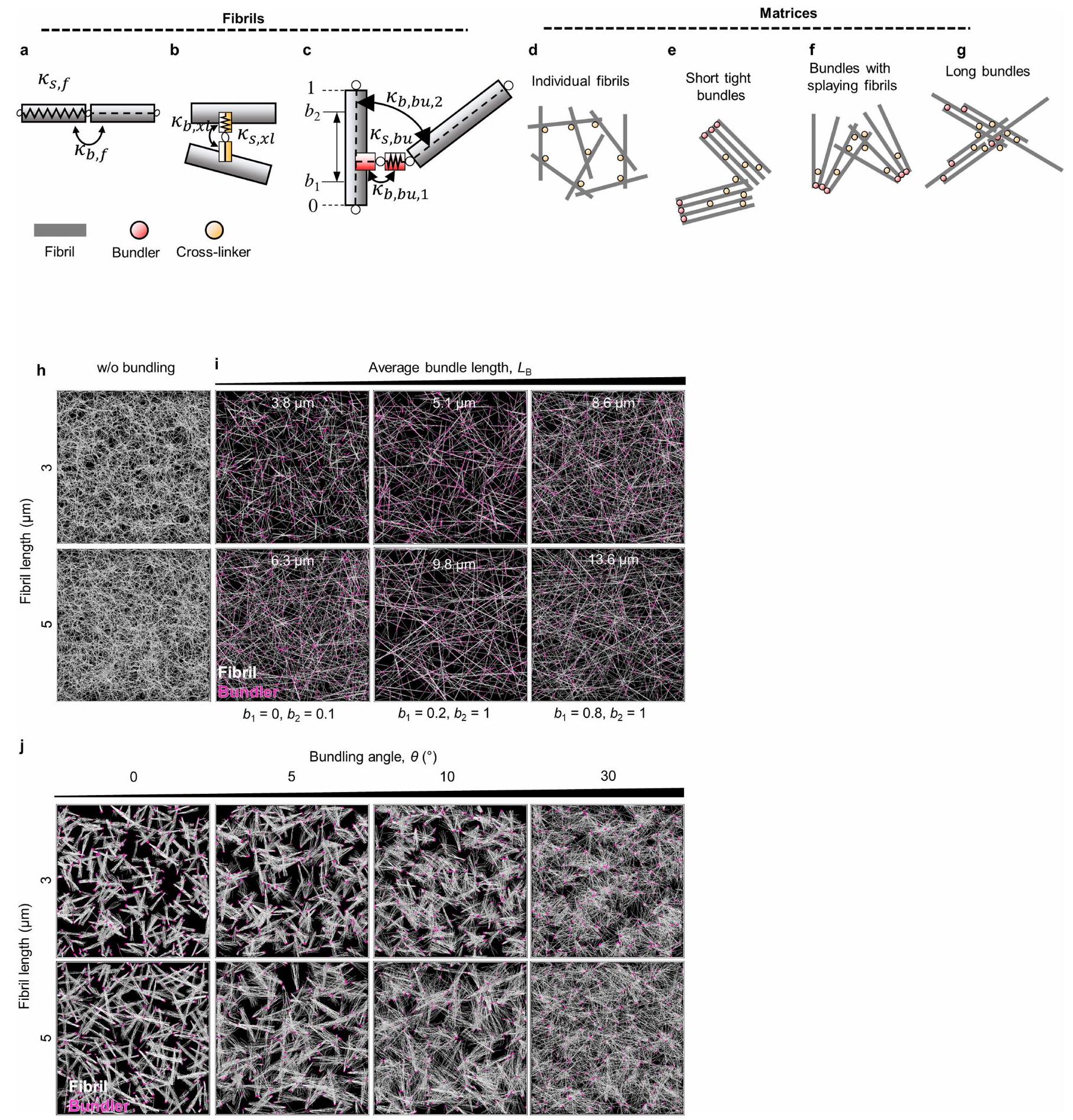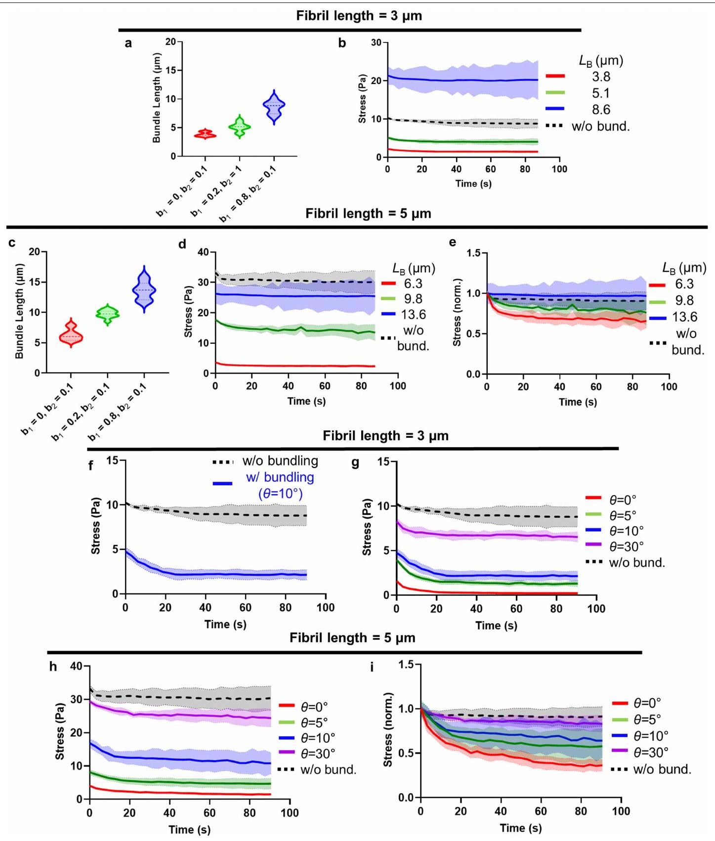 لدراسة كيفية تأثير هيكل المصفوفة على اللزوجة، قمنا بمحاكاة مصفوفات الكولاجين مع تباين في معلمين هيكليين لنمذجة نشاط AGEs: متوسط طول حزمة ألياف الكولاجين وزاوية التجميع، كبديل للتباين (الشكل 3p,q). تتصل مصفوفات الكولاجين من خلال مجموعة من الروابط الضعيفة، المعروفة بأنها تعمل داخل وبين ألياف الكولاجين (الشكل الممتد 4a-g) ويمكن أن تكون أساس استرخاء الإجهاد واللزوجة في مصفوفات الكولاجين من النوع 1، والروابط الناتجة عن (الشكل الممتد 4h,j). الشبكات المجمعة أكثر تباينًا وتظهر استرخاء إجهاد أسرع مقارنة بالشبكات غير المجمعة (الشكل 3r). يؤدي تقليل طول الألياف (الشكل 3s والشكل الممتد 5a-e) أو زاوية الحزمة (الشكل 3t والشكل الممتد 5f-i) إلى زيادة تباين الشبكة مما يؤدي إلى استرخاء إجهاد أسرع.