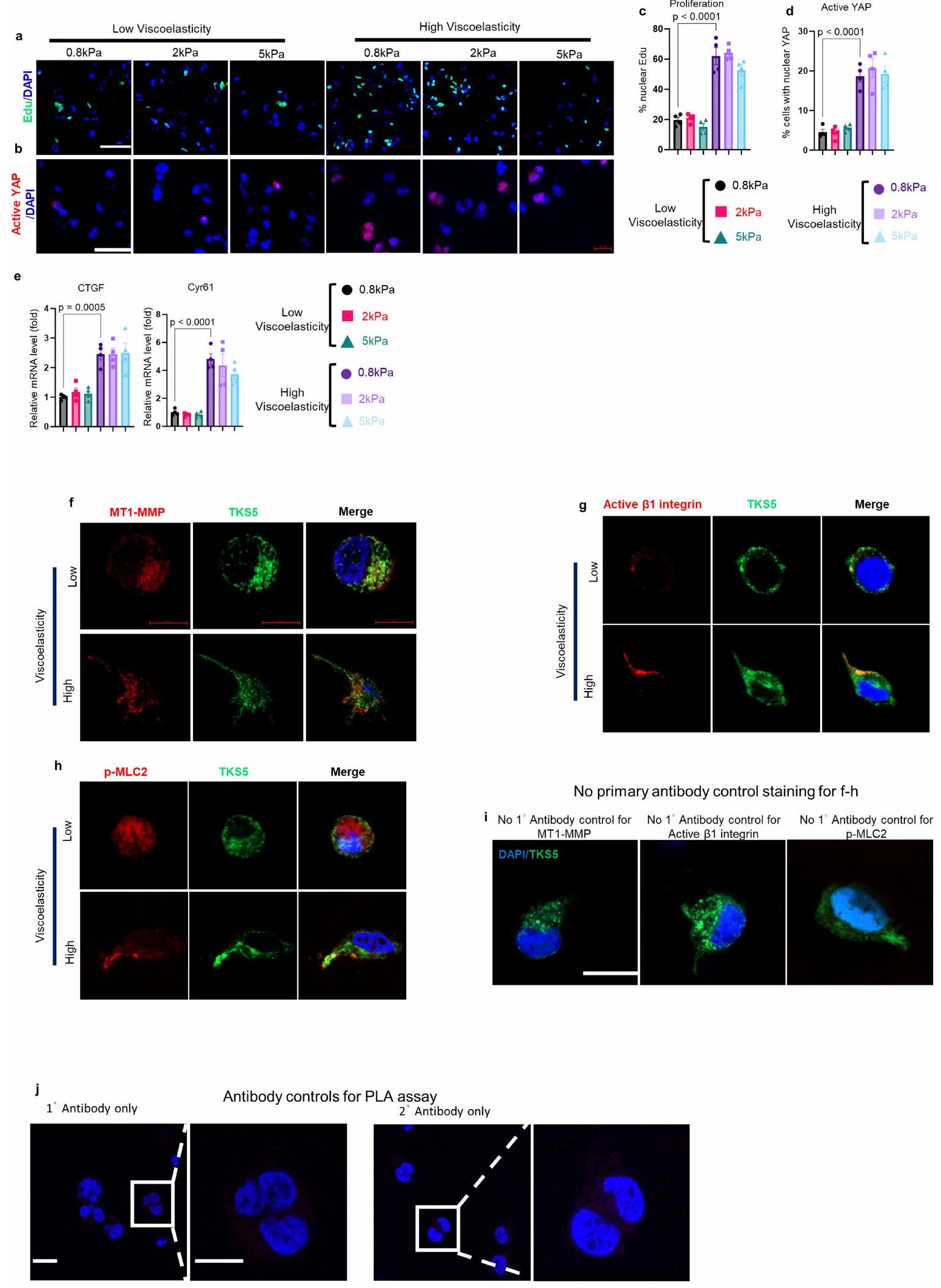 بالنظر إلى هذه النتائج، كان سؤالنا التالي هو كيف تنقل ECM اللزج المرن إشارات التكاثر والغزو. لاختبار تأثيرات اللزوجة مباشرة، قمنا بإنشاء شبكات بوليمرية متشابكة من هيدروجيل الألجينات وطبقة القاعدة المعاد تكوينها (rBM) للزراعة ثلاثية الأبعاد. تم احتواء خلايا HCC (الشكل 5 والشكل الإضافي 7a-e) في هيدروجيلات rBM-IPN. بنفس الصلابة (معامل يونغ، 2 كيلو باسكال) ولكن بمستويات مختلفة من اللزوجة المرنة (الشكل 5أ). في الجل عالي اللزوجة المرنة، أظهرت الخلايا زيادة في التكاثر (الشكل 5ب، هـ)، وتنشيط YAP (الشكل 5ج، و) وتكوين هياكل شبيهة بالانفادوبوديا إيجابية لـ TKS5 (المعروفة أيضًا باسم SH3PXD2A) وإيجابية لـ MT1-MMP بالإضافة إلى شكل أكثر استطالة (الشكل 5د، ز). عندما تم زيادة معامل يونغ تدريجيًا إلى 5 كيلو باسكال، لم نلاحظ زيادة في تكاثر الخلايا، أو تنشيط YAP، أو تحفيز جيناته المستهدفة (الشكل التمديدي 7أ-هـ). الانفادوبوديا هي بروزات رفيعة خطية مرتبطة بغزو الخلايا السرطانية وهجرتها. في الجل عالي اللزوجة المرنة، اكتشفنا علامات نموذجية مثل TKS5 وMT1-MMP (الشكل 5د والشكل التمديدي 7ف) بالإضافة إلى الإنتغرين النشط.و سلسلة الميوسين الخفيفة الفسفورية MLC ) (الشكل 7g,h في البيانات الموسعة، على التوالي). يتم عرض ضوابط الأجسام المضادة في الشكل 7i في البيانات الموسعة. كما أن الإنتغرين-تم الإبلاغ عن تفاعلات المصفوفة التي تعدل نقل الآليات الميكانيكية في خلايا سرطان الثدي في الهلام عالي اللزوجة.، استخدمنا الإنتجرين-الأجسام المضادة الموجهة بشكل محدد (الشكل 5h-j). وقد أدت هذه إلى تقليل التكاثر (الشكل 5h) وهدف YAP CTGF (الشكل 5i) وزيادة دائرية الخلايا (الشكل 5j).