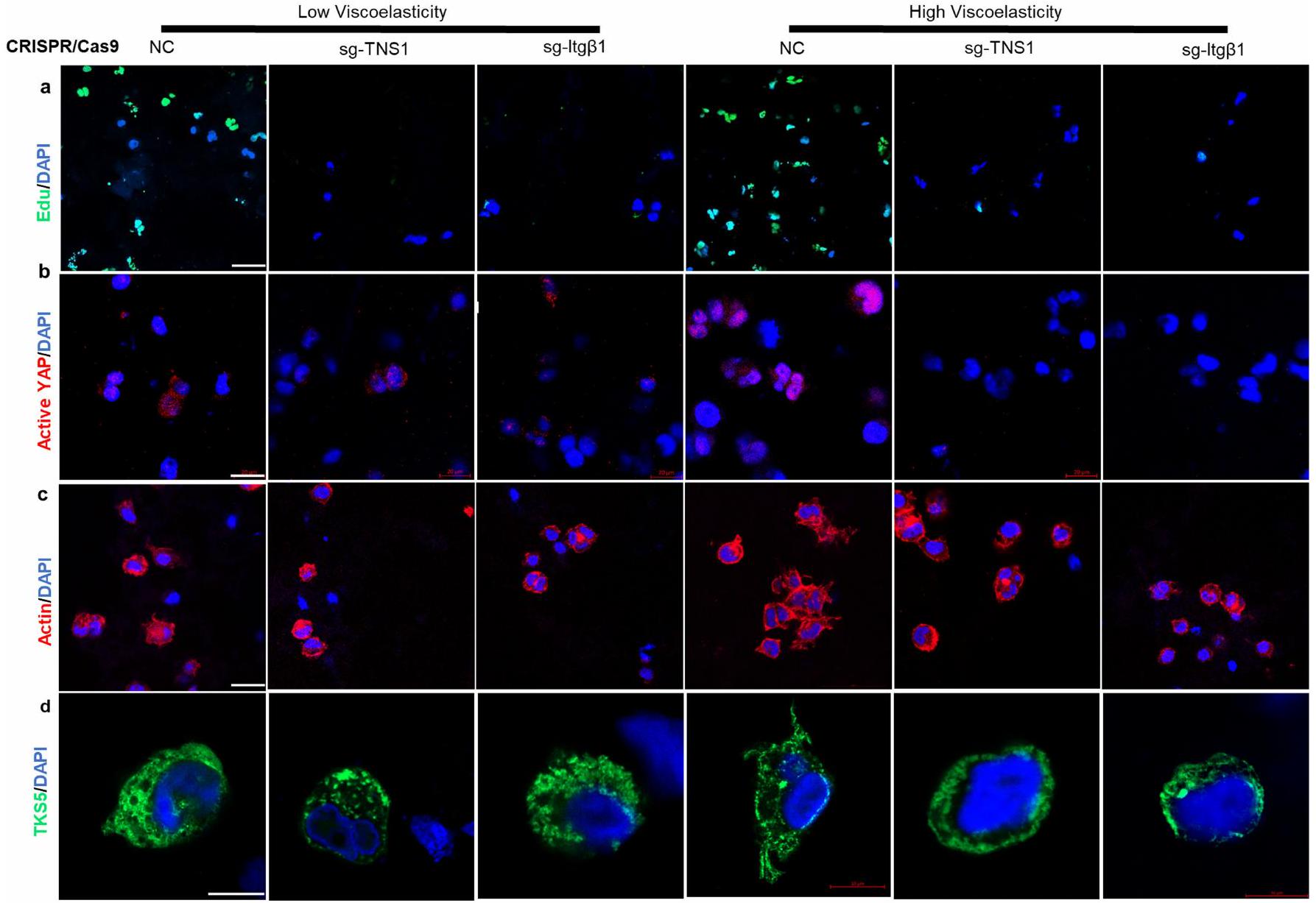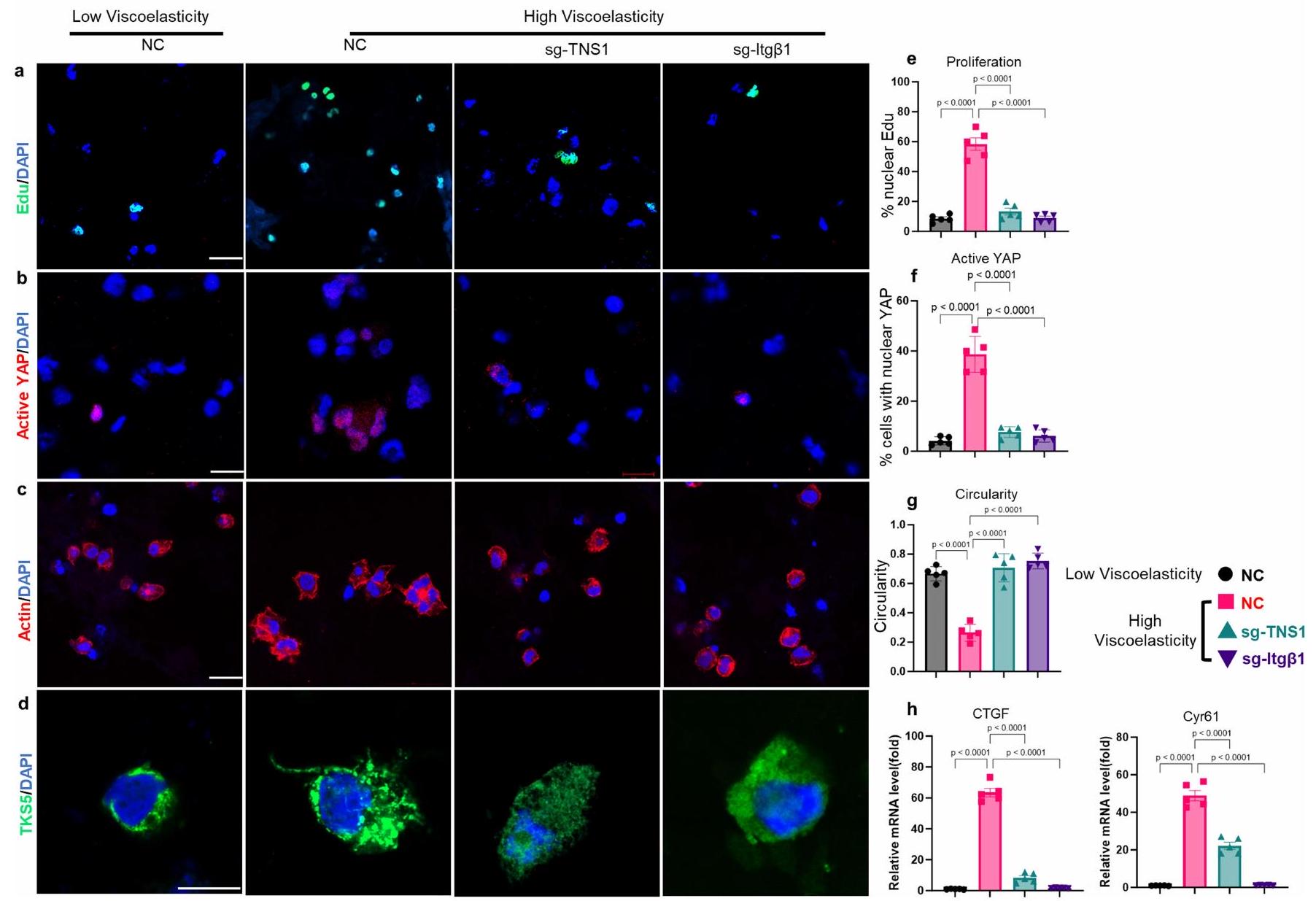 إي جي جي أو إنتغرينأجسام مضادة تمنع (ITGB1). تكاثر الخلايا (ساعة؛ EdU)، هدف YAPودائرية الخلية ( ) تم تحليلها. التعبير في الخلايا في الهلاميات المائية ذات اللزوجة المنخفضة أو العالية.تظهر PLAs ارتباطًا مباشرًا بين TNS1 والإنتجرين (ITGB1) في الهلاميات المائية عالية اللزوجة المرنة (; شريط القياس، تم تحليل إشارة PLA (30 خلية في 5 هلامات لكل مجموعة،، كل منها). تم نقل خلايا Huh7-Cas9 باستخدام بلازميدات تحتوي على RNA توجيهي CRISPR لـ TNS1 (sgTNS1)، إنتغرين (sgITGB1) أو sgRNA التحكم (NC) ومدمجة في هيدروجيل منخفض أو عالي اللزوجة. تم تحليل التكاثر (n) وتفعيل YAP (o) ودائرية الخلايا (p).كل. q، مخطط TNS1، الذي يعمل كعنصر رئيسي في مجمع مستشعر ميكانيكي ECM من خلال الارتباط بالإنتيجرين. في ECM عالي اللزوجة المرنة. تم إنشاء الرسم البياني باستخدام BioRender. البيانات هي متوسط س.م.تشير القيم إلى تجارب مستقلة. تم إجراء التحليل الإحصائي باستخدام اختبار غير متزاوج ذو طرفين.-اختبارات ( و ) واختبار ANOVA أحادي الاتجاه يليه اختبار المقارنات المتعددة لتوكاي ( و ). عدد المحولاتانخفضت البؤر مقارنة بالفئران التي تم حقنها بـ sgRNA الضابطة (الشكل 12b-d من البيانات الموسعة، على التوالي)، وكان التعبير عن أهداف YAP Ctgf (المعروف أيضًا باسم Ccn2) وCyr61 (Ccn1) أقل (الشكل 12e من البيانات الموسعة). معًا، تشير هذه البيانات إلى أن TNS1 هو جزء من ق clutch جزيئي يربط بين الإنتغرينات المرتبطة بـ ECM والهيكل الخلوي الأكتين-مايوسين استجابةً لللزوجة العالية (الشكل 5q).