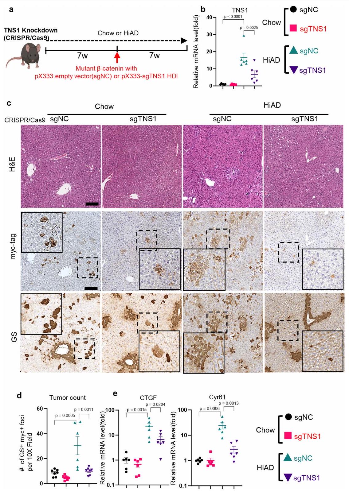 لدراسة الدور داخل الجسم لـ TNS1، استخدمنا نهجًا موجهًا بواسطة CRISPR-Cas9 حيث تم استهداف TNS1 في وقت HDI. تم حقن الفئران التي تتغذى على نظام غذائي عادي أو نظام غذائي HiAD هيدروديناميكيًا كما في السابق، بما في ذلك إما RNA دليل فردي لـ Tns1 (sgTNS1) أو بلازميدات sgRNA التحكم، وتم euthanized بعد 7 أسابيع من الحقن (الشكل البياني الممتد 12a). في الفئران المعالجة بـ sgTNS1، تم قياس تعبير Tns1 و