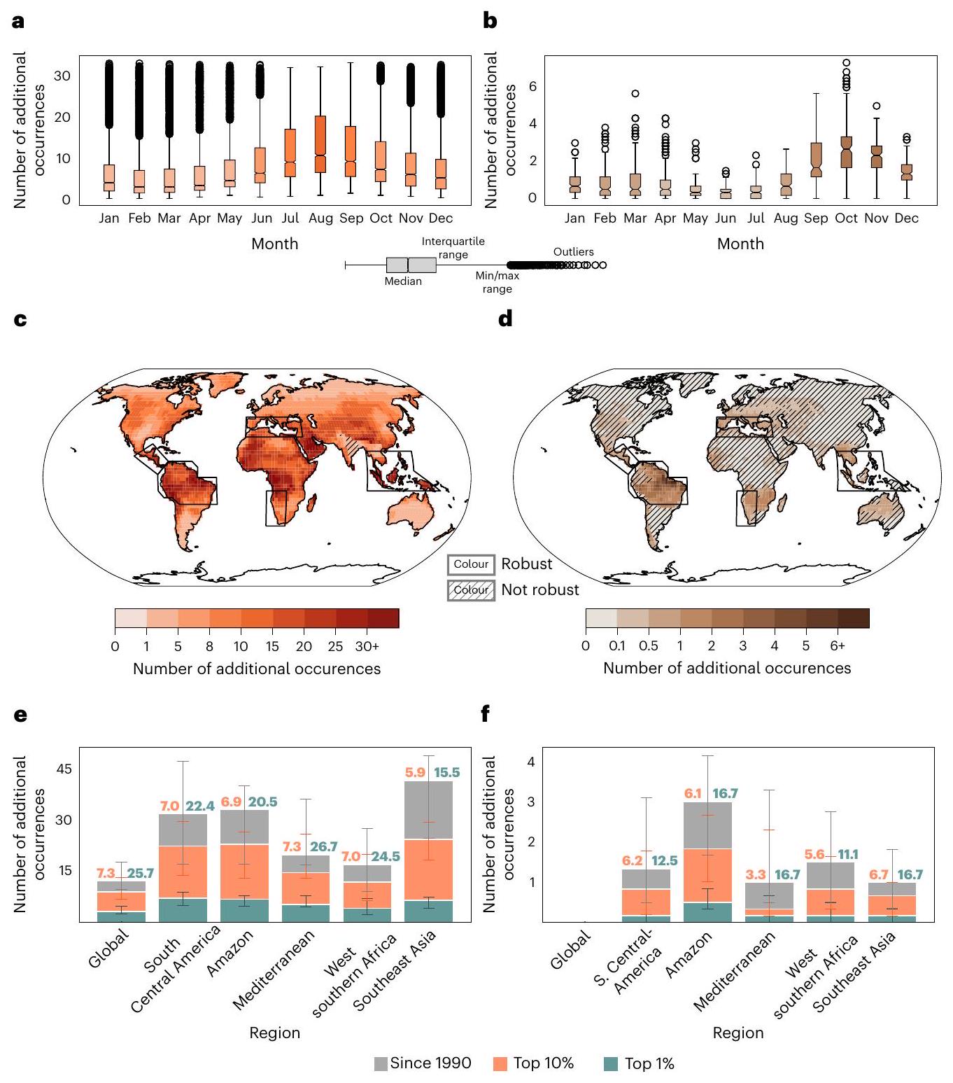confidence intervals represented as vertical lines. Estimates are based on 600 ensemble members. c, Regional breakdown of the global top