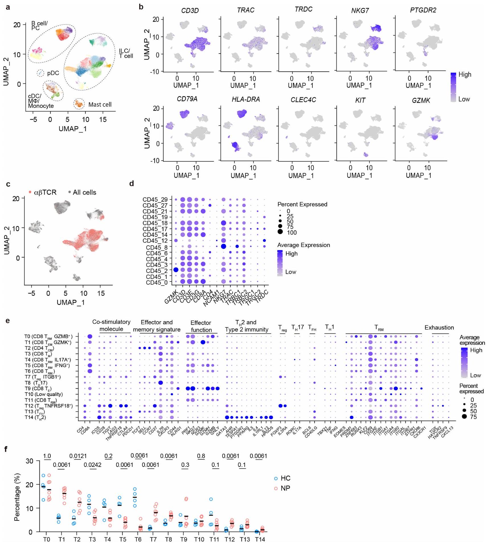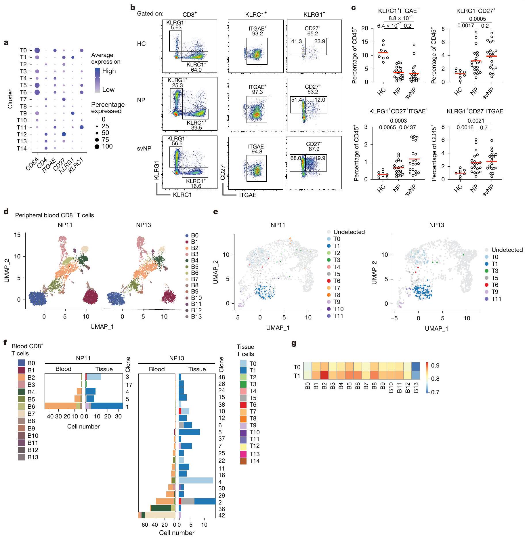 لاستكشاف إمكانية أن تساهم تجمعات خلايا T المستنسخة في علم الأمراض والانتكاس، قمنا بإجراء تسلسل RNA الرسول على مستوى الخلية الواحدة (scRNA-seq) لعدد إجمالي من CD45خلايا من سبع عينات جراحية من NP (NP7-13) وأربع عينات جراحية من HC (HC6 و8 و9 و10) (الشكل 1a وb والجدول التكميلي 1). خضع ثلاثة من مرضى NP السبعة (NP11-NP13) لعملية جراحية ثانية لعلاج انتكاسة NP الخاصة بهم في وقت الدراسة، وتم حفظ خزعات NP السابقة من العملية الجراحية الأولى بالتبريد (كريو). من خلال مقارنة تسلسلات TCR من خزعتين NP لكل من هؤلاء المرضى الثلاثة، يمكننا تحديد النسخ الشائعة من خلايا T (الشكل 1b). تم تضمين ما مجموعه 42,466 خلية مناعية في التحليل وتم تجميعها وفقًا لتراكيبها الجينية؛ وتم تحديد مجموعات فرعية من اللمفاويات، والخلايا الشجرية، والوحيدات، وخلايا الماست من خلال تعبير الجينات المميزة الخاصة بها (الشكل التكميلي 1a وb). بعد المناطق المتغيرة الكاملة للطول منتم تجميع مستقبلات TCR (الشكل التوضيحي الممتد 1c)، وتمكن خلايا T الحاملة لمستقبلات وظيفية من التكتل في مجموعات متنوعة في كل من أنسجة HC و NP (الشكل 1d، e، الشكل التوضيحي الممتد 1d، e والجدول التكميلي 2). كما هو متوقع، كانت وفرة خلايا T المساعدة 2 (تم زيادة مجموعة (T14)، وهي محرك مرض معروف، بشكل ملحوظ في المرضى الذين يعانون من NP مقارنة بمجموعة HC. (الشكل 1f من البيانات الموسعة). بالإضافة إلى ذلك، واحد مجموعة فرعية (T1) وأربعةكانت مجموعات خلايا T (T2 و T7 و T8 و T12) أكثر وفرة أيضًا في أنسجة NP مقارنةً بأنسجة HC (الشكل 1f من البيانات الموسعة).