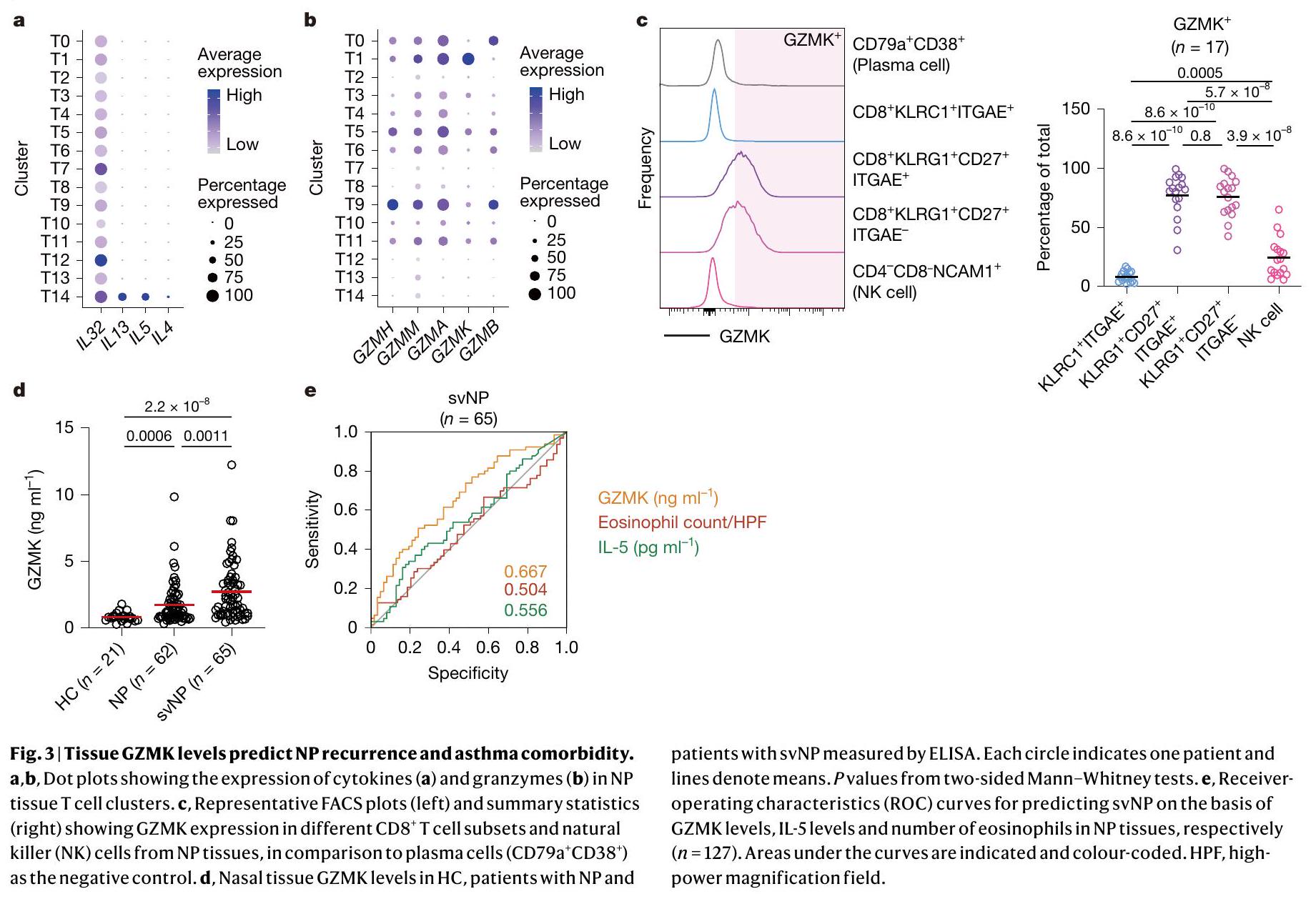 بعد ذلك، بحثنا بعناية عن جزيئات التأثير التي قد تستخدمها خلايا T1 في عملية المرض. تعزز السيتوكينات من النوع 2 (مثل IL-4 و IL-5 و IL-13) تجنيد الحمضات، وإعادة تشكيل الأنسجة، وتنشيط خلايا B في مجرى الهواء، مما يمثل المحركات الأكثر رسوخًا لالتهاب الجيوب الأنفية المزمن ومرض الأنسجة الربوي.. ومع ذلك، لم تعبر خلايا T1 عن أي mRNA تقريبًا لسيتوكينات النوع 2 (الشكل 3أ). تعتبر الجرانزيمات جزيئات فعالة مهمة تعبر عنها خلايا CD8الخلايا. من بين جميعالخلايا في أنسجة NP، كانت خلايا T1 تعبر بشكل فريد عن مستوى عالٍ من نسخ Granzyme K (GZMK) (الشكل 3ب). وقد وُجدت خلايا T التي تعبر عن GZMK في الالتهابات المرتبطة بالشيخوخة ومجموعة متنوعة من الأمراض الالتهابية.من خلال صبغ الخلايا داخلية، كان GZMK معبرًا عنه بشكل كبير في كل من ITGAEو ITGAEنسب من خلايا T1 ولكن ليس فيتم إفراز GZMK بواسطة هذه الخلايا عند تحفيز TCR (الشكل 3c). بالإضافة إلى خلايا T، تم التعبير عن GZMK أيضًا بواسطة مجموعة صغيرة من خلايا القاتل الطبيعي (الشكل 1b، d والشكل 3c) التي زادت بشكل ملحوظ في المرضى الذين يعانون من svNP، على الرغم من أن هذه الخلايا كانت أقل وفرة مقارنة بخلايا T1 التي تعبر عن GZMK (الشكل 2e، f والشكل 3c). لاستكشاف الدور المحتمل لـ GZMK في مسببات NP، قمنا بتحليل الأنسجة الأنفية من مجموعة من 148 مريضًا (21 HC، 62 NP و65 svNP) مع تمثيل متوازن للعمر والجنس (الشكل التكميلية 6a-d)، ووجدنا أن مستويات بروتين GZMK في الأنسجة ولكن ليس في المصل كانت مرتفعة في NP وأيضًا في svNP (الشكل 3d والشكل التكميلية 6e). مثلت مستويات GZMK في الأنسجة عامل خطر لـ svNP كما تم التنبؤ به بواسطة نموذج انحدار خطي متعدد تم تعديله للجنس والعمر ومؤشر كتلة الجسم (الجدول التكميلية 2). في الواقع، كانت مستويات GZMK في الأنسجة علامة بيولوجية تنبؤية أفضل لـ svNP من مستويات الإيوزينوفيل في الأنسجة وIL-5، وهما عاملان خطر معروفان جيدًا لـ svNP. (الشكل 3e). بالإضافة إلى ذلك، كانت مستويات GZMK مرتبطة إيجابيًا بوفرة الإيوزينوفيلات النسيجية في المرضى الذين يعانون من svNP (الشكل التوضيحي 2a). مجتمعة، تدعم هذه البيانات إمكانية أن يمكن أن تؤدي الخلايا إلى تفاقم التهاب المسالك الهوائية وتعزز الأمراض الهوائية المتكررة من خلال الإنزيم الفعال GZMK.