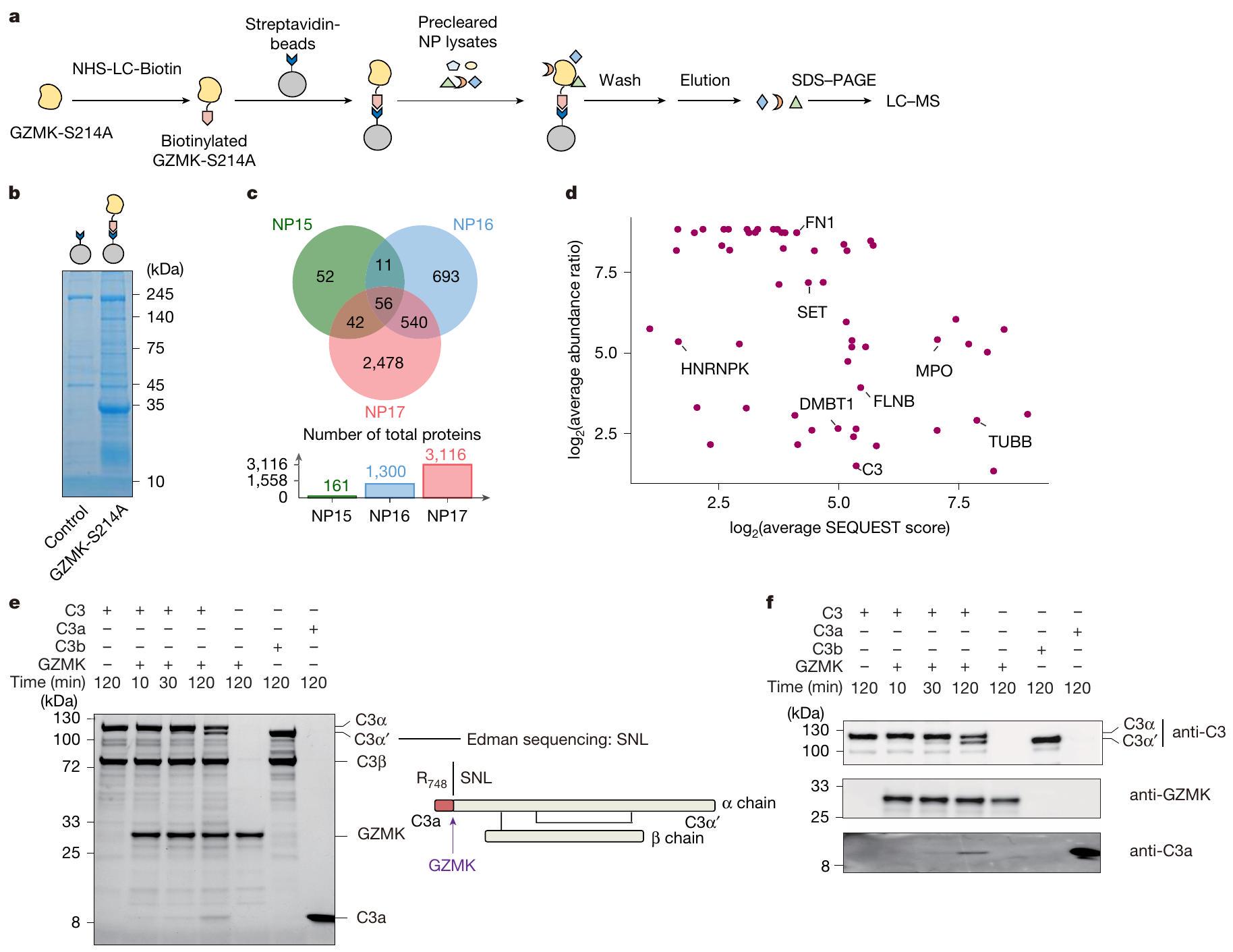 للتحقيق فيما إذا كان وكيف يمكن أن يعزز GZMK الالتهاب، قمنا بتوصيف الركائز المحتملة له في أنسجة NP. لهذا الغرض، قمنا بتعبير GZMK البشري المعاد تركيبه من النوع البري وغير النشط سير.طفرة -to-Ala (GZMK-S214A) في خلايا 293-F (الشكل 4a من البيانات الموسعة). تم تأكيد نشاطهم الإنزيمي وعدم نشاطهم في المختبر. باستخدام الركائز البديلة (الشكل التمديدي 4ب، ج). بعد ذلك، قمنا بترسيب الأجسام المضادة المحتملة للركائز GZMK عن طريق حاضنات مرتبطة بـ GZMK-S214A مع مستخلصات أنسجة NP المأخوذة من ثلاثة مرضى خضعوا لإزالة NP جراحياً. من خلال تحليل البروتينات المسحوبة باستخدام الكروماتوغرافيا السائلة-مطياف الكتلة (الشكل 4أ، ب)، حددنا 161 و1,300 و3,116 بروتينات مرتبطة بـ GZMK من هؤلاء المرضى الثلاثة (NP15-17)، على التوالي (الشكل 4ج و