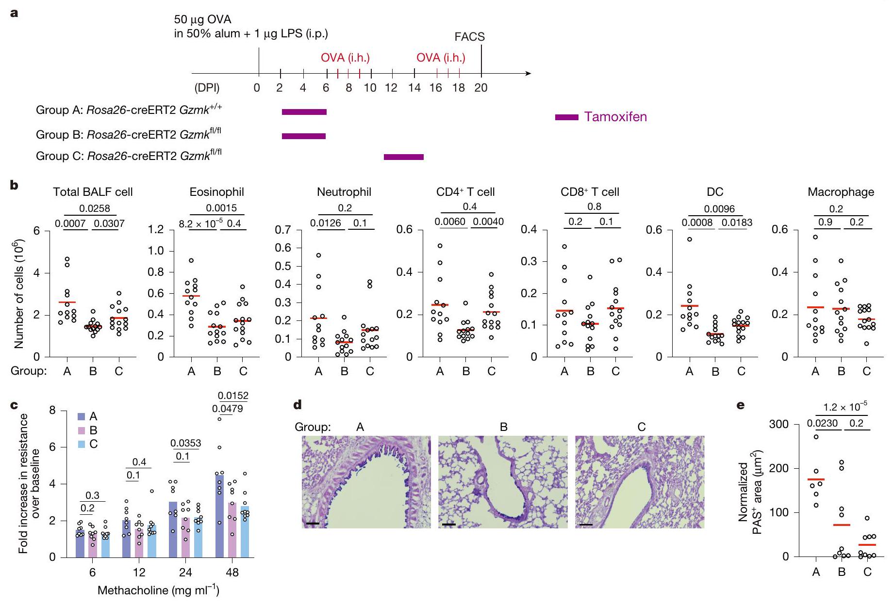 علاوة على ذلك، اختبرنا أيضًا ما إذا كان تثبيط GZMK عن طريق الأدوية يمكن أن يخفف من الربو في الفئران. بعد تحفيز الربو، تم علاج هذه الفئران كل يومين باستخدام مركب صناعي دواء يثبط بقوة نشاط GZMK لكل من الإنسان والفأر، D-Phe-Pro-Arg-chloromethylketone (PPACK)، ولكن ليس مثبط GZMB كاربوبنزوكسي-إيل-غلوتاميك-ثريونين-أسبارتيك-فلوروميثيل كيتون (Z-IETD-FMK)قلل بشكل كبير من تسلل الإيوزينوفيل إلى مجرى الهواء (الشكل التوضيحي الممتد 10a-c). كما قلل PPACK بشكل كبير من فرط تنسج خلايا الجُبَيْبَات وحسن وظيفة الرئة في الربو لدى الفئران (الشكل التوضيحي الممتد 10d-f). مجتمعة، تدعم بياناتنا أن GZMK الناتج عنتعتبر خلايا GZMK محركًا مهمًا لالتهاب مجرى الهواء وتقدم المرض، وأن إزالة أو تثبيط GZMK يمكن أن تكون استراتيجية علاجية مفيدة.