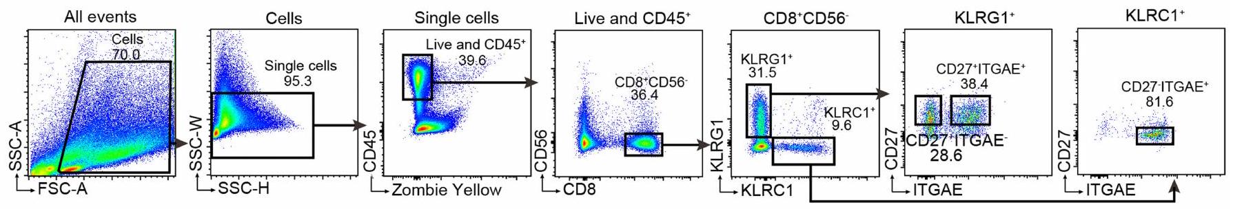 تم غسل خلايا الإنسان المعزولة من الأنسجة الأنفية والدم المحيطي مرة واحدة بمحلول PBS، وتم حجبها بواسطة مواد حجب TruStain البشرية (BioLegend) وتم صبغها بأجسام مضادة سطحية مختلفة في محلول FACS (PBS مع 1% FBS و لمدة 30 دقيقة على الثلج. لتلوين الخلايا داخل الخلايا، تم تثبيت الخلايا وتمريرها باستخدام مجموعة CytoFix/Perm (BD)، وتم تلوينها بأجسام مضادة ضد المستضدات داخل الخلايا لمدة 30 دقيقة على الثلج. تشمل مواد التلوين الزومبي الأصفر، PerCP-Cy5.5-anti-CD45 (النسخة HI30)، PE-anti-CD8 (النسخة HIT8a)، BV711-anti-CD8 (النسخة HIT8a)، APC-Cy7-anti-NCAM (النسخة HCD56)، PE-cy7-anti-KLRG1 (النسخة SA231A2)؛ PE-Cy5-anti-KLRC1 (النسخة S19004C)، FITC-anti-ITGAE (النسخة Ber-ACT8)، PE-Dazzle594-anti-ITGAE (النسخة Ber-ACT8)، BV421-anti-CD27 (النسخة O323)، PE-anti-GZMK (النسخة GM26E7) وAPC-anti-GZMB (النسخة GB11) من BioLegend، APC-H7-anti-CD19 (النسخة SJ25C1) من BD Biosciences. بالنسبة لنماذج الفئران، تم أولاً حجب خلايا BALF بـالأجسام المضادة (BioXCell)، وتم صبغها بأجسام مضادة مختلفة في محلول FACS على الثلج لمدة 30 دقيقة. تشمل مواد الصبغ AF700-مضاد-CD11c (نسخة HL3، BD)، eFluor660-مضاد-CD3 (نسخة 17A2، eBioscience)، APC-مضاد-I-A (النسخة AF6-120.1، BioLegend)، FITC-مضاد-Ly6G (النسخة IA8، BD)، PE-Cy7-مضاد-CD11b (النسخة M1/70، BD)، PE-مضاد-Siglec-F (النسخة E50-2440، BD)، APC-Cy7-مضاد-CD8 (النسخة 53-6.7، BioLegend)، Percp-Cy5.5-مضاد-CD4 (النسخة RM4-5، BD) و zombie yellow (BioLegend). تم جمع البيانات على جهاز قياس الطيف الكامل Aurora (Cytek). تم تحليل جميع بيانات FACS باستخدام برنامج FlowJo (Treestar).