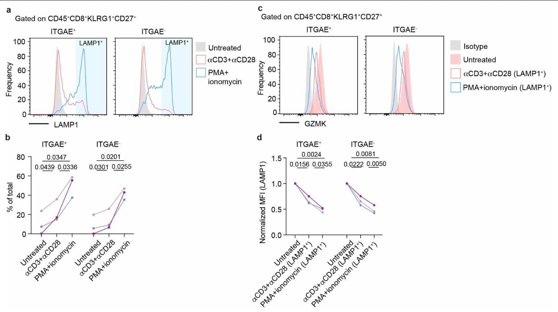 قمنا أيضًا بتوصيفتحت مجموعات خلايا T التي تحتوي على تلك النسخ المستمرة. أظهرت خلايا TO ذاكرة T المقيمة التقليدية ( ) نمط الخلية، يعبر عن جينات أساسية للإقامة في الأنسجة، مثل ITGAE و CD69 و PRDM1 و ZNF683 و RUNX3 (المرجع 12). احتوى مجموعة T1 على عدد قليل نسبيًا من الخلايا ولكن العديد منها تعبر عن خلايا الذاكرة الفعالة Tتشمل العلامات KLRG1 و CD27 (الشكل 2أ والشكل البياني الممتد 1هـ). من ناحية أخرى، لم تعبر هذه الخلايا بشكل كبير عن الجينات المرتبطة بالوظائف الفعالة، مثل TBX21 و CX3CR1. كما أن خلايا T1 عبرت عن مستوى نسبي مرتفع من EOMES، وهو عامل نسخ مرتبط بالاستمرارية على المدى الطويل. (الشكل البياني الموسع 1e). تشير هذه البيانات إلى أن النسخ المستمرة هي في الغالب وخلايا شبيهة بـ.