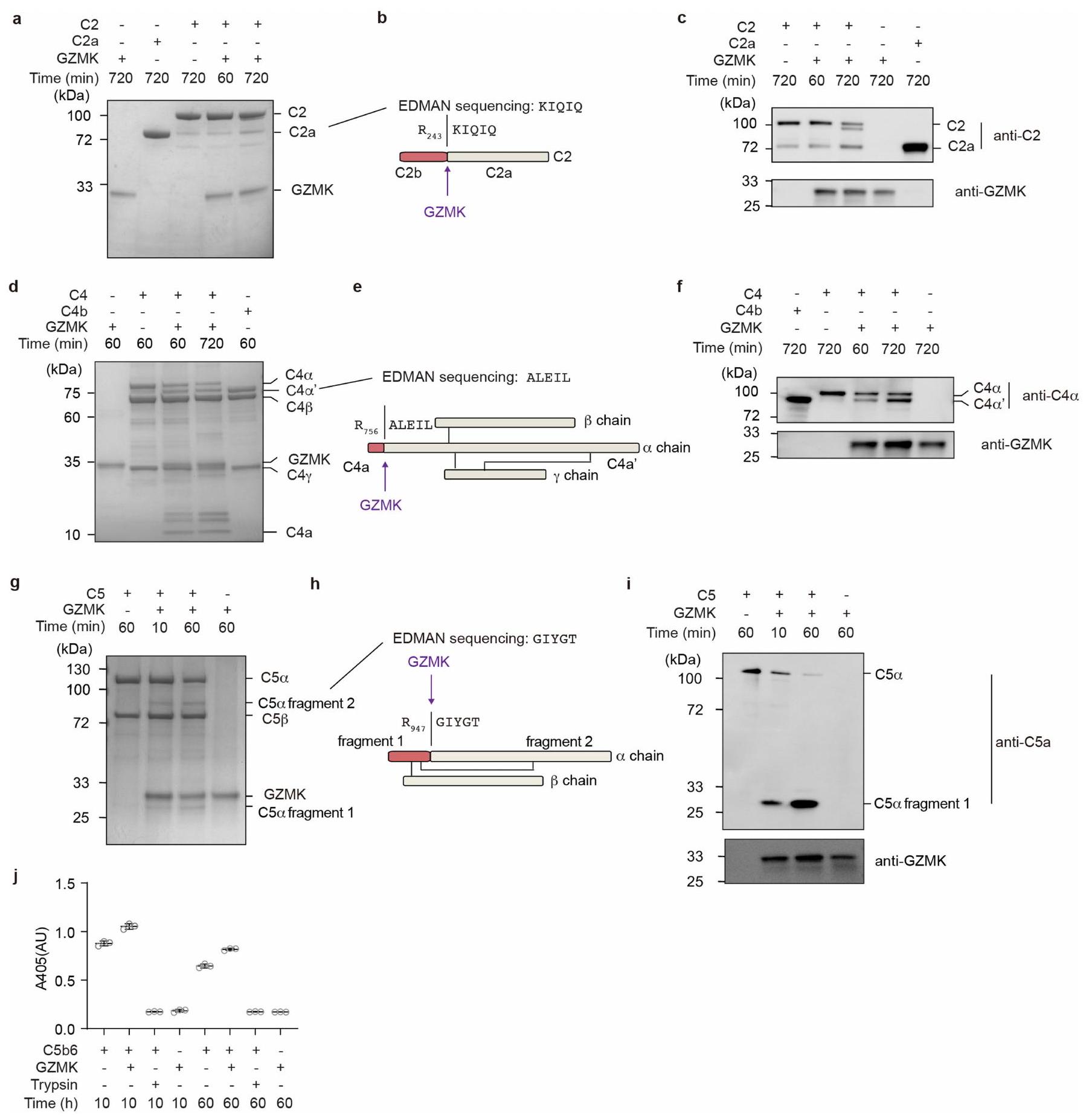 نظرًا لأن عدة بروتينات مكملة تم تحديدها كركائز محتملة في تفاعل GZMK-S214A (الجدول التكميلي 4)، قمنا باختبار ما إذا كان GZMK يمكن أن يستهدف عدة خطوات في سلسلة المكملات. باستخدام بروتينات مكملة نقية من المصل كركائز، وجدنا أن GZMK كان قادرًا على قطع C2 إلى C2a وC2b (الشكل البياني الموسع 5a-c)، وC4 إلى C4a وC4b (الشكل البياني الموسع 5d-f). لذلك، يمكن أيضًا من حيث المبدأ أن يعزز GZMK تشكيل المحول الكلاسيكي C3 C4b2a. علاوة على ذلك، GZMK يمكن أن يقطع C5 (الشكل 5g-i من البيانات الموسعة) بطريقة غير تقليديةلزيادة نشاط معقد هجوم الغشاء (الشكل 5j من البيانات الموسعة). لذلك، يعتبر GZMK جزيءًا فعالًا مؤيدًا للالتهابات يمكن أن يعمل من خلال تنشيط سلسلة المكملات.