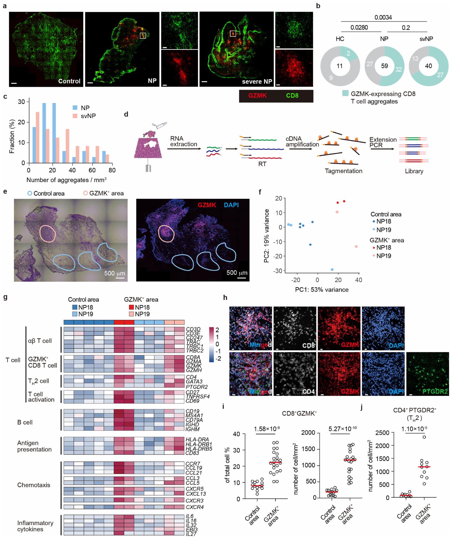 قمنا بعد ذلك بإجراء تحليل المناعة النسيجية للأنسجة الأنفية من الأصحاء والمرضى الذين يعانون من التهاب الأنف. بينما كان هناك عدد قليل جداً من CD8تم العثور على خلايا T في HC، بأعداد كبيرة منتم العثور على خلايا، بما في ذلك تلك التي تعبر عن GZMK، في أنسجة NP، وخاصة من المرضى الذين يعانون من أمراض أكثر شدة؛ حيث شكلت العديد من تلك الخلايا تجمعات حول الأوعية الدموية، مما يذكر بالهياكل اللمفاوية الثلاثية (الشكل التوضيحي الممتد 6a-c). بالإضافة إلى ذلك، كان C3 موجودًا بكثرة في GZMK.مناطق تجمع الخلايا (الشكل التكميلي 7a، b)، تشير إلى تحويل C3 في الموقع بواسطة GZMK. لتوصيف المحتويات الالتهابية في هذه التجمعات من CD8 المعبر عن GZMKالخلايا، قمنا باستئصال الأنسجة المحتوية على التجمعات بواسطة الميكروتشريح بالليزر وأجرينا تسلسل RNA الكمي (الشكل 6d-f من البيانات الموسعة). كما هو متوقع، كانت المستويات الأعلى من و تم العثور عليها فيالمناطق أكثر من المناطق النسيجية التي تحتوي على القليلالخلايا (الشكل الإضافي 6g والشكل التكميلية 7c، d). المناطق الغنية بالتعبير عن GZMKكما احتوت الخلايا على مستويات أعلى من النسخ المرتبطة بـالخلايا، خلايا B والخلايا النخاعية (الشكل التوضيحي الممتد 6 ج والجدول التكميلية 5)، ولكن ليسوخلايا T التنظيمية (الشكل التوضيحي 7e). كما احتوت مناطق تجمع الخلايا على مستويات أعلى من الكيموكينات ومستقبلات الكيموكينات المهمة لاستقطاب الخلايا الالتهابية (على سبيل المثال، CXCR3، CXCR4، CCL4 وCCL5) ولتنظيم الهياكل اللمفاوية الثلاثية (على سبيل المثال، CCR7، CXCR5 ورابطة كل منهما).مستويات أعلى من السيتوكينات الالتهابية