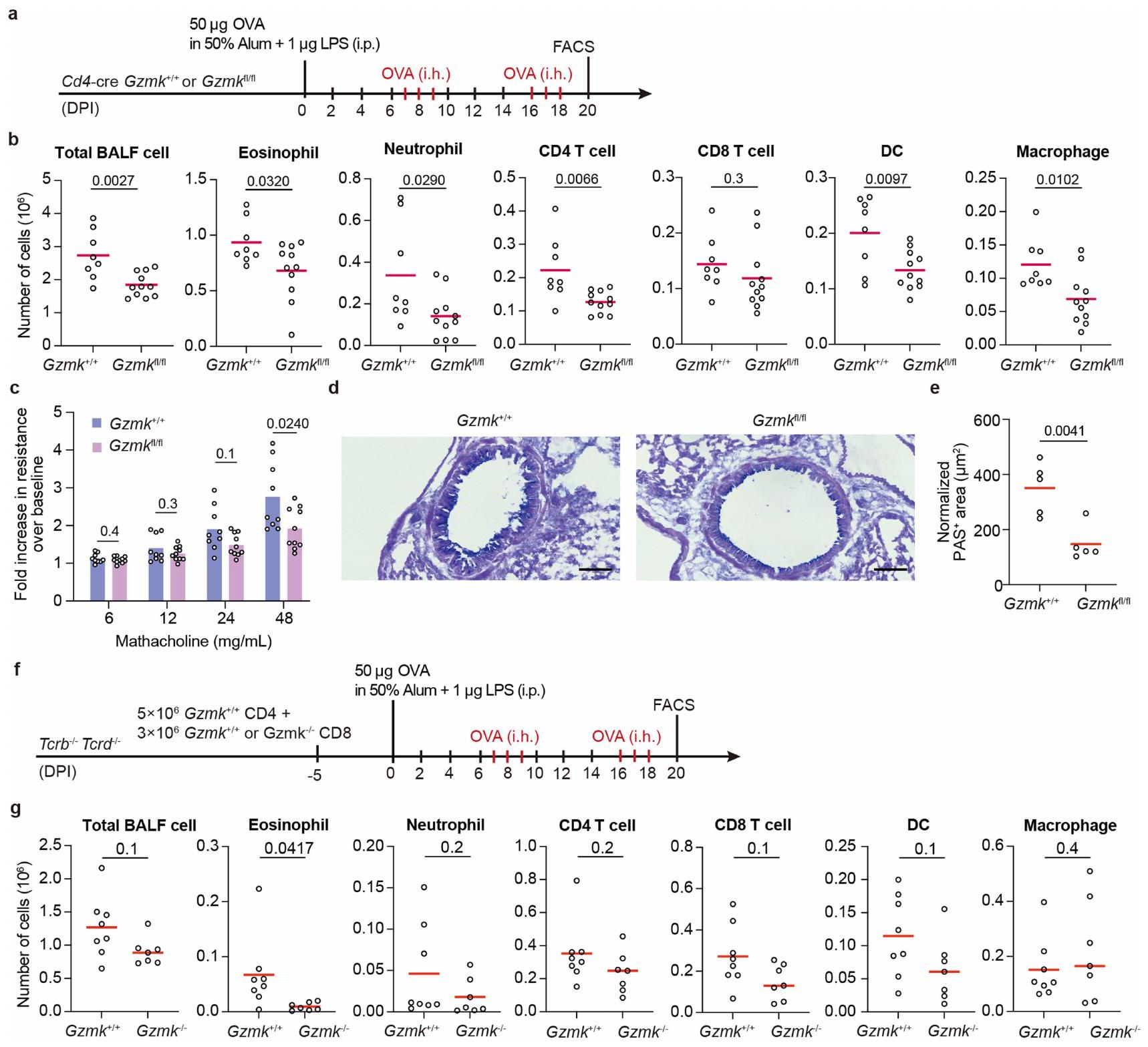 بعد ذلك، اتبعنا نهج فقدان الوظيفة لفحص تطور التهاب المسالك الهوائية في CD4-cre;Gzmkالفئران، التي تفتقر إلى Gzmk في خلايا T (الشكل التوضيحي الممتد 8a). مقارنةً بـ CD4-cre؛Gzmkتحكم، CD4-cre؛ Gzmkكانت الحيوانات تحمل أعدادًا منخفضة بشكل ملحوظ من الإيوزينوفيلات، العدلات، CD4تعمل خلايا T، والخلايا الشجرية، والبلعميات في سائل غسيل القصبات الهوائية (الشكل 8b من البيانات الموسعة). تحسنت وظيفة الرئة لدى هذه الفئران الأخيرة، حيث أظهرت تحملًا أفضل تجاه تضيق مجرى الهواء المستحث وانخفاض فرط تنسج خلايا الكأس (الشكل 8c-e من البيانات الموسعة). لذلك، فإن GZMK المستمد من خلايا T يعزز الالتهاب في مجرى الهواء.