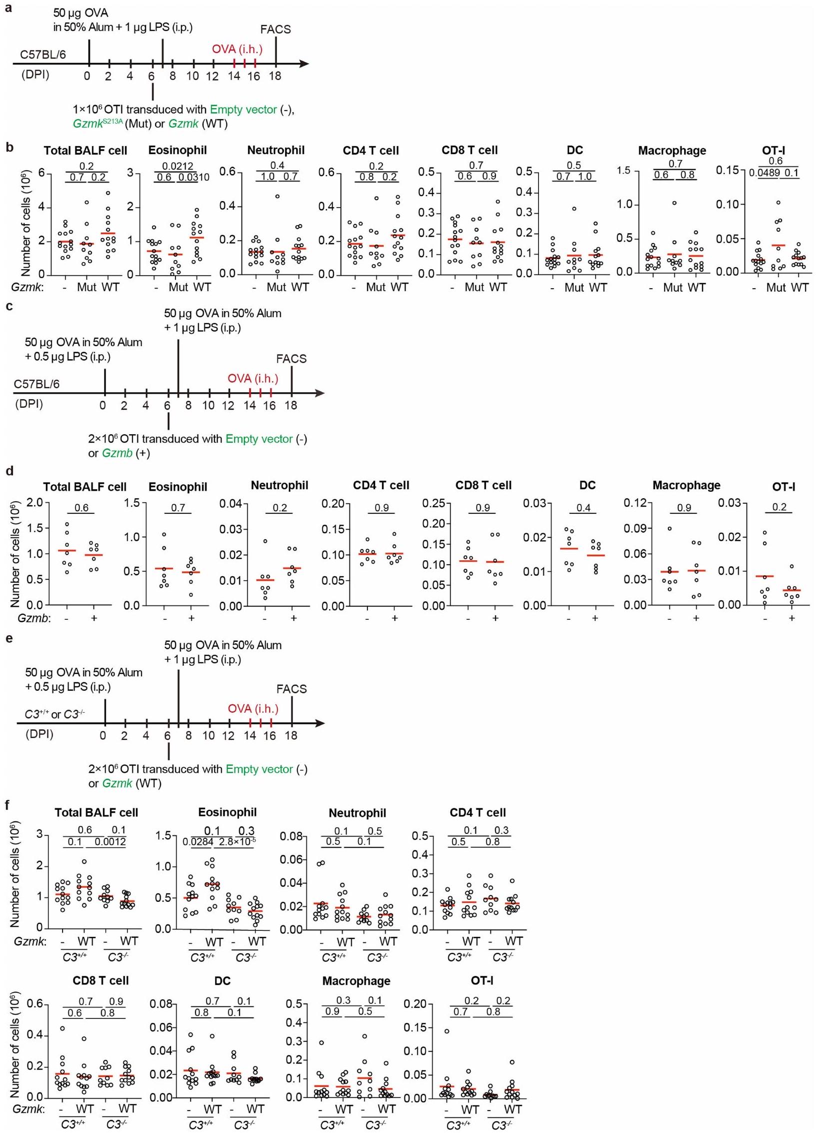 لاختبار مباشرة ما إذا كان GZMK من CD8تعمل خلايا T على تعزيز مرض الالتهاب في مجرى الهواء، وقد أنشأنا نموذج ربو في الفئران باستخدام الألبومين البيضوي (OVA) كمستضد. تم تحصين فئران C57BL/6 أولاً باستخدام OVA الممزوج في 50% من الألومنيوم والليبوبوليسكاريد (LPS)، ثم تم تحديها عن طريق استنشاق OVA المتناثر بعد أسبوع. تم تكرار استنشاق OVA مرتين لمحاكاة تكرار المرض، وتم إجراء تحليلات فرز الخلايا المعتمدة على الفلورية (FACS) لخلايا سائل غسل القصبات الهوائية (BALF) بعد يومين من كل تحدٍ (الشكل البياني الموسع 7a، b). تم استقطاب مجموعات متنوعة من خلايا المناعة إلى مجرى الهواء عند تحدي OVA، بما في ذلك الحمضات، العدلات، خلايا، تم تقييد تعبير Gzmk بشكل كبير إلى CD8الخلايا ولكنها شبه غير قابلة للاكتشاف في CD4الخلايا التائية، وزادت بشكل تدريجي مع التحديات المتكررة لـ OVA (الشكل البياني الموسع 7d). من خلال تحليلات تسلسل RNA أحادي الخلية (scRNA-seq) أكدنا تعبير Gzmk في مجموعة فرعية من CD8 في سائل غسيل الشعب الهوائية (BALF).خلايا T، وبعض من هذه الخلايا T التي تعبر عن Gzmk زادت أيضًا من تعبير Itgae (الشكل البياني الممتد 7e، f)، مشابهة جدًا لخلايا T1 في أنسجة NP البشرية.
