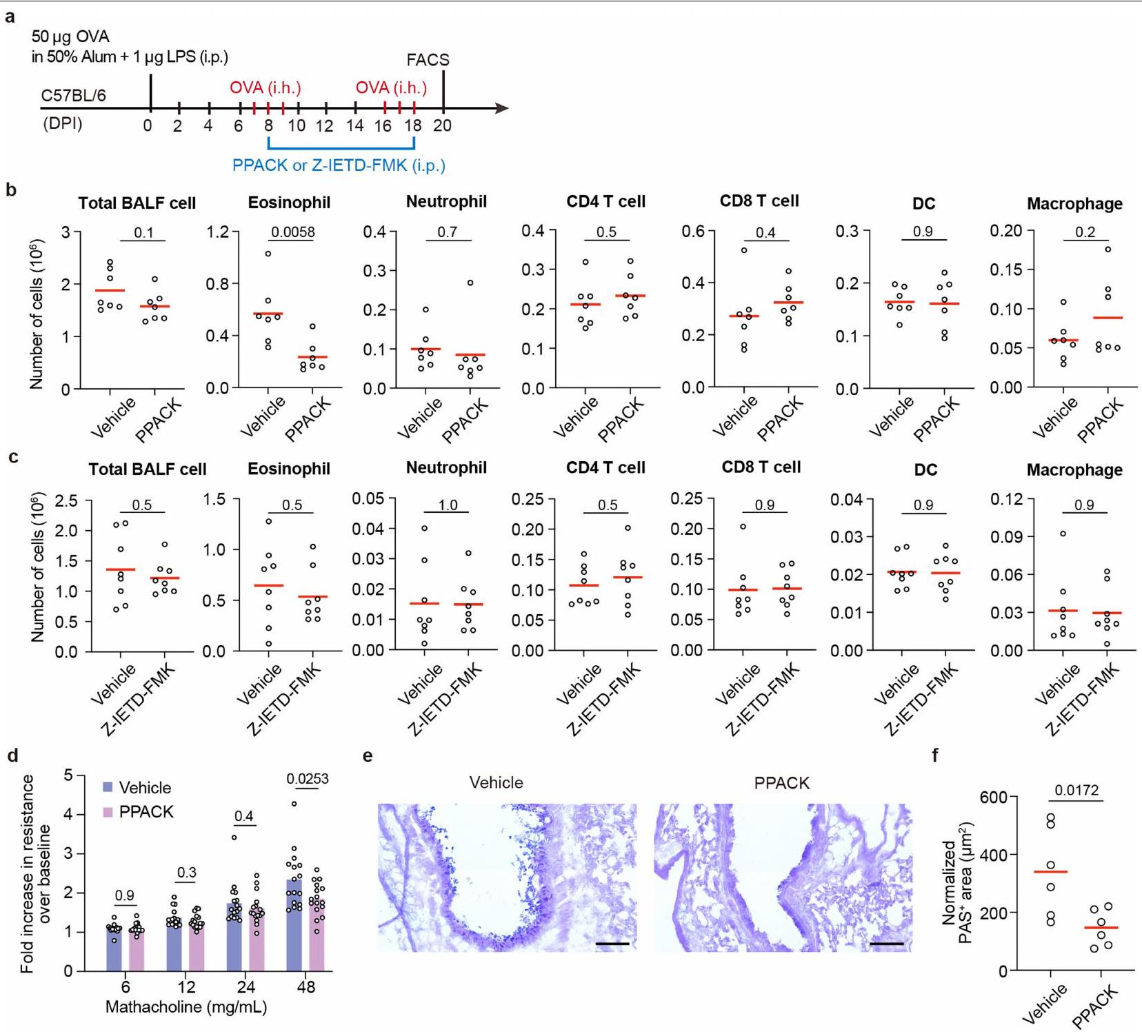 تم بناء نماذج مرض التهاب مجرى الهواء في الفئران باستخدام طريقتين. في الطريقة الأولى، تم تحفيز الفئران أولاً عن طريق التحصين داخل البطن بـ من OVA (سيغما-ألدريتش) المستحلب في الألوم (إنفيتروجن) معمن LPS (سيغما-ألدريتش). ثم تم تحدي الفئران بواسطةأيروسول OVA ) في غرفة تعرض للجسم بالكامل (Yiyankeji) لمدة 30 دقيقة يوميًا لمدة ثلاثة أيام متتالية بدءًا من أسبوع واحد بعد التطعيم. تم تكرار العملية مرة أو مرتين بفاصل 7 أيام، وتم إجراء التحليلات في الوقت المحدد. من أجل تحفيز حذف Gzmk، تم استخدام Rosa26-creERT2 وتم إعطاء الفئران يوميًا 2 ملغ من التاموكسيفين (ApexBio) المذاب فيزيت بذور عباد الشمس (JSENB) لمدة خمسة أيام متتالية في الوقت المحدد. في بعض التجارب،تم استخدام الفئران لتحفيز الربو. تم نقل هذه الفئران بالتبني معCD4 الطحاليخلايا T وCD8 الطحاليخلايا T منأوفئران، تم تنقيتها بواسطة كرات مغناطيسية (Miltenyi Biotec)، قبل 5 أيام من التحصين داخل الصفاق بمستضد OVA. تم تحضير PPACK (MedChemExpress) و Z-IETD-FMK (Selleck) في PBS يحتوي على 3% DMSO بتركيزلتثبيط نشاط GZMK و GZMB، على التوالي. تم حقن كل فأر داخل الصفاق بـمثبط كل يومين من 8 إلى 18 يومًا بعد التطعيم كما هو موضح.