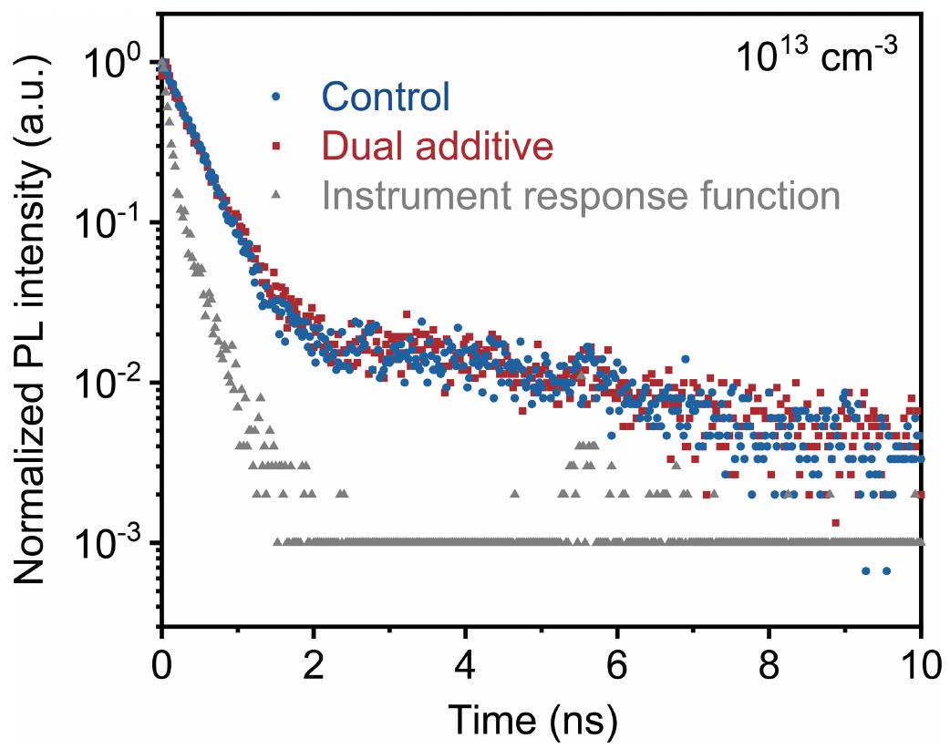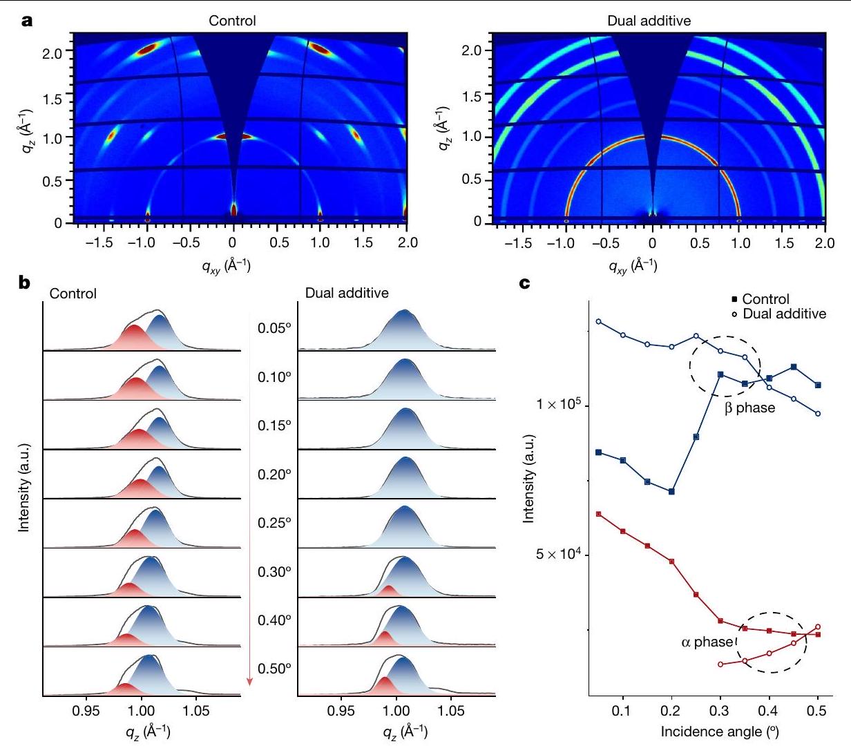 To investigate how the dual additives can induce an increased proportion of the tetragonal phase, we conducted in situ absorption-spectra measurements during the film-annealing process (Extended Data Fig. 8). We observe that PyNI-additive-alone perovskite film exhibits dominant absorption peaks at