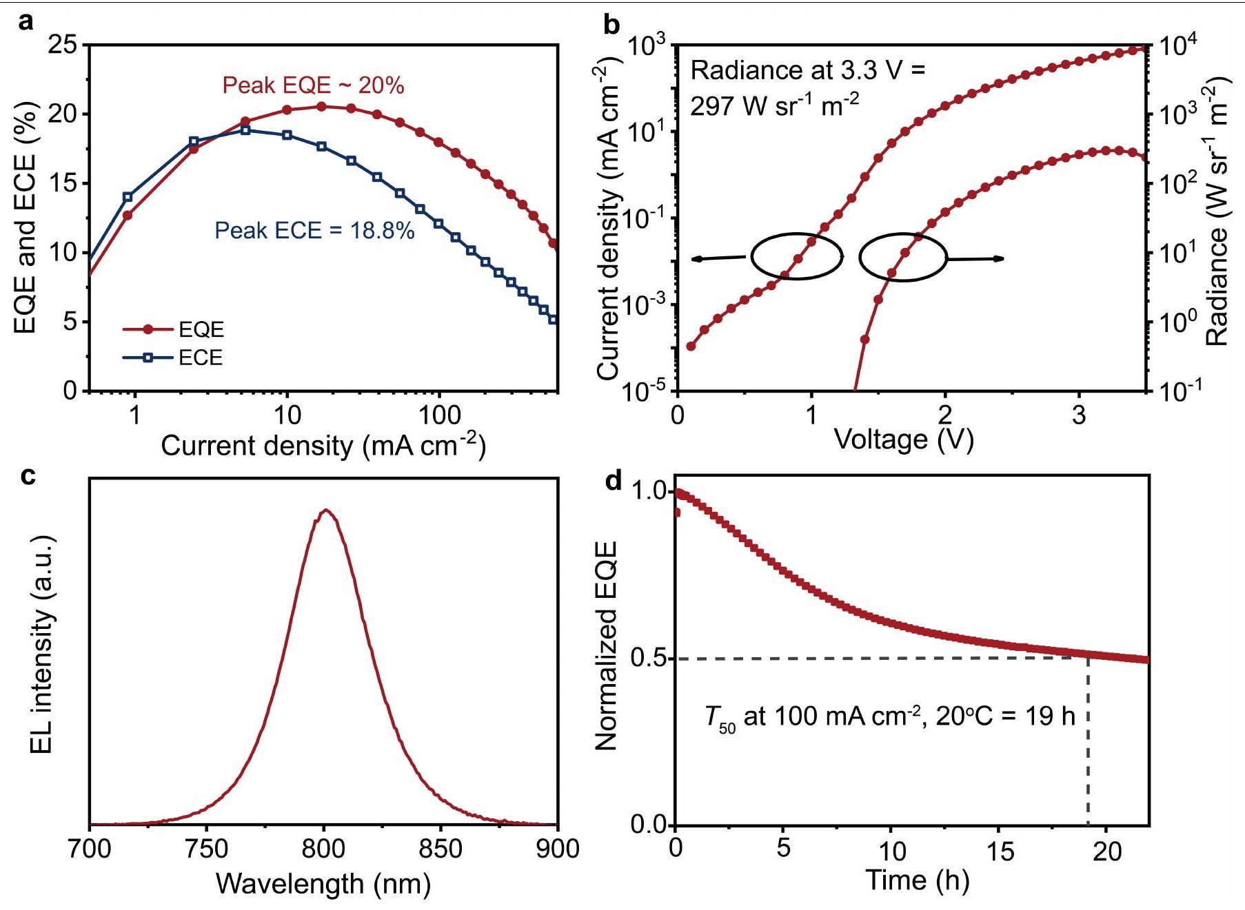 density-dependent EQE and ECE. b, Dependence of current density and radiance on bias voltage (the maximum radiance is