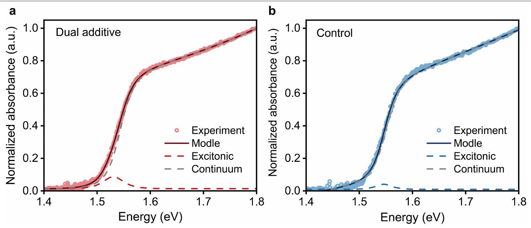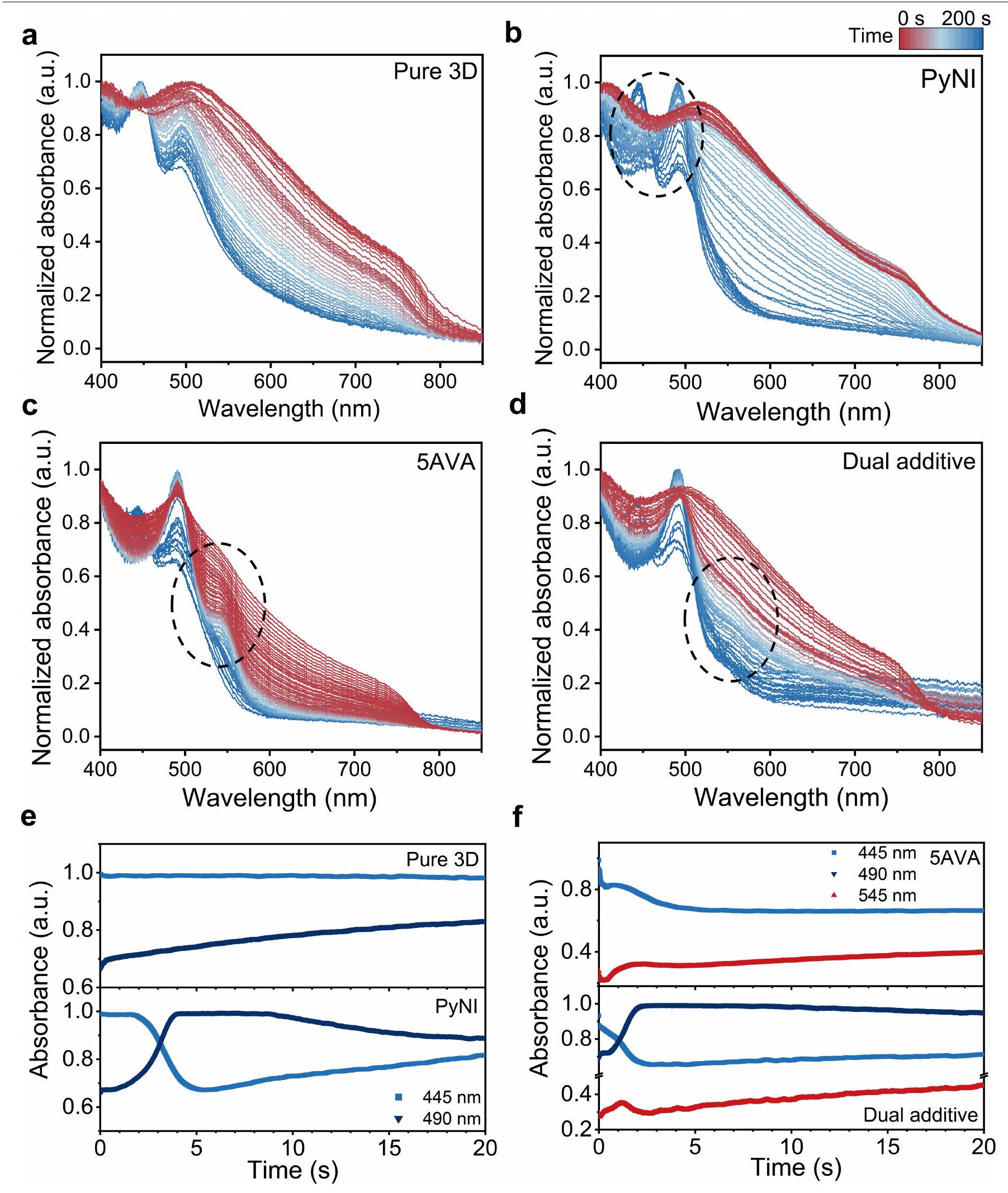 لتحقيق كيفية تأثير الإضافات المزدوجة على زيادة نسبة الطور الرباعي، قمنا بإجراء قياسات طيف الامتصاص في الموقع خلال عملية تلدين الفيلم (الشكل البياني الممتد 8). نلاحظ أن فيلم البيروفسكايت الذي يحتوي على إضافة PyNI فقط يظهر قمم امتصاص سائدة عند