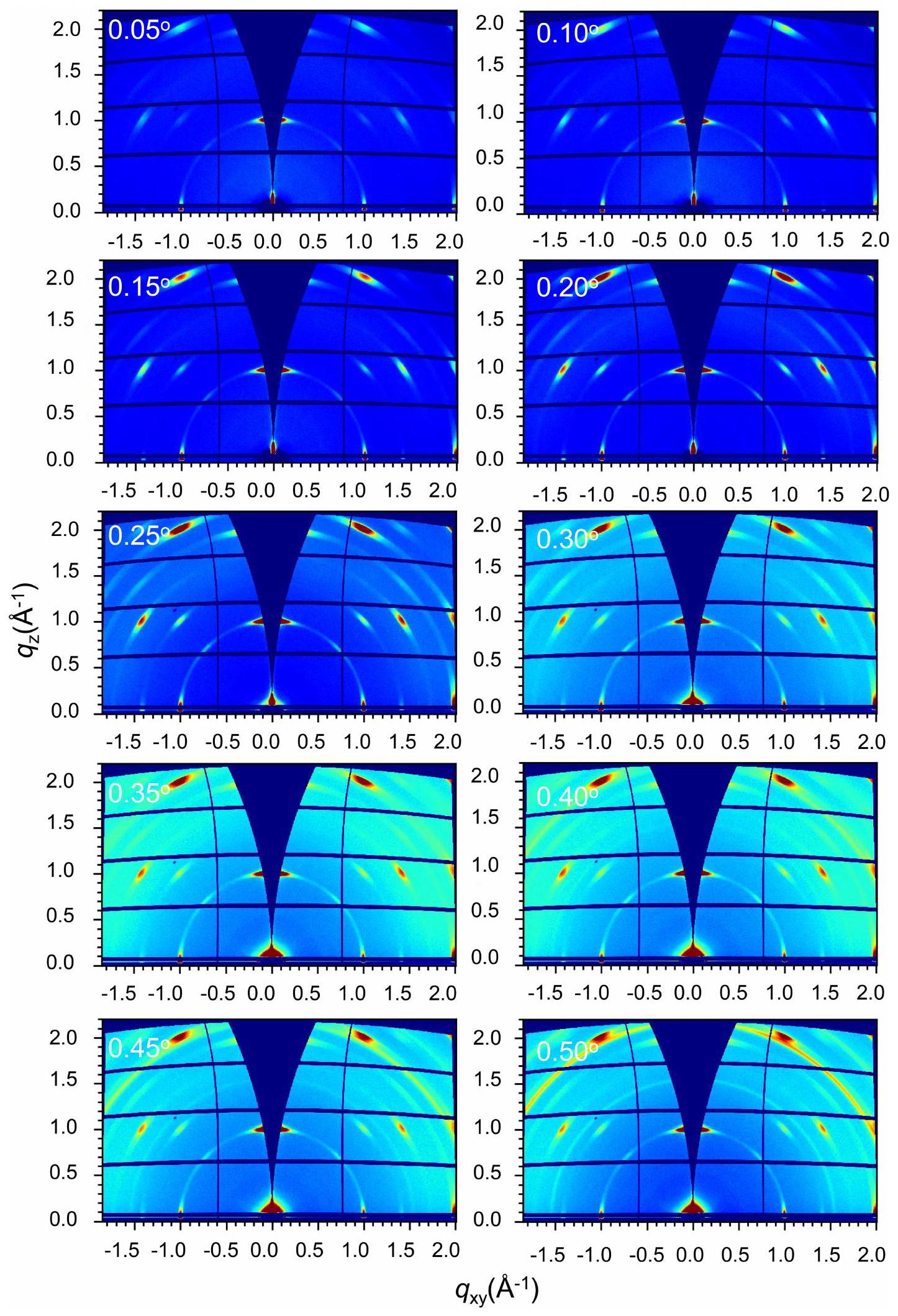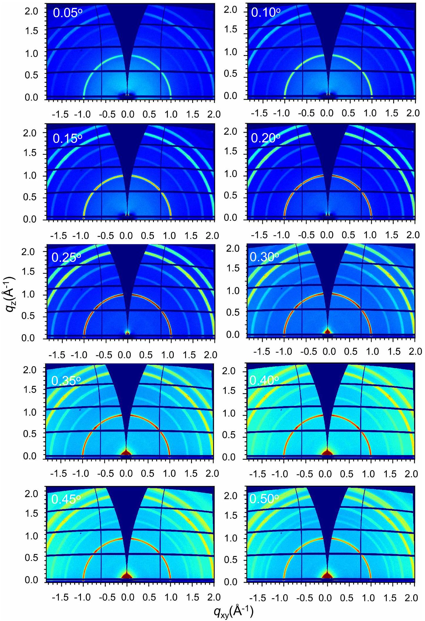Extended Data Fig. 6|2D GIWAXS patterns of control perovskite film with various incidence angles. The incidence angles of
