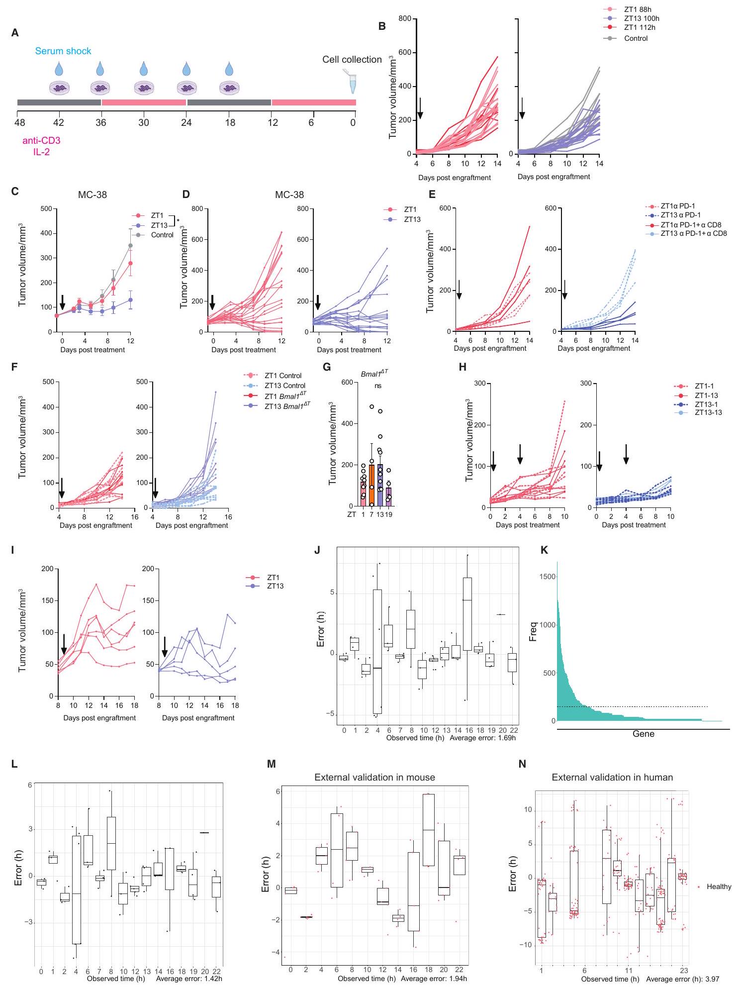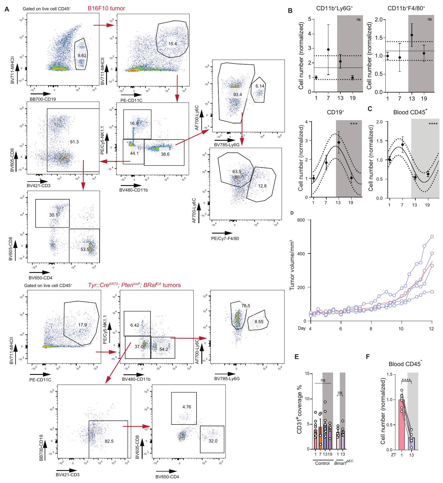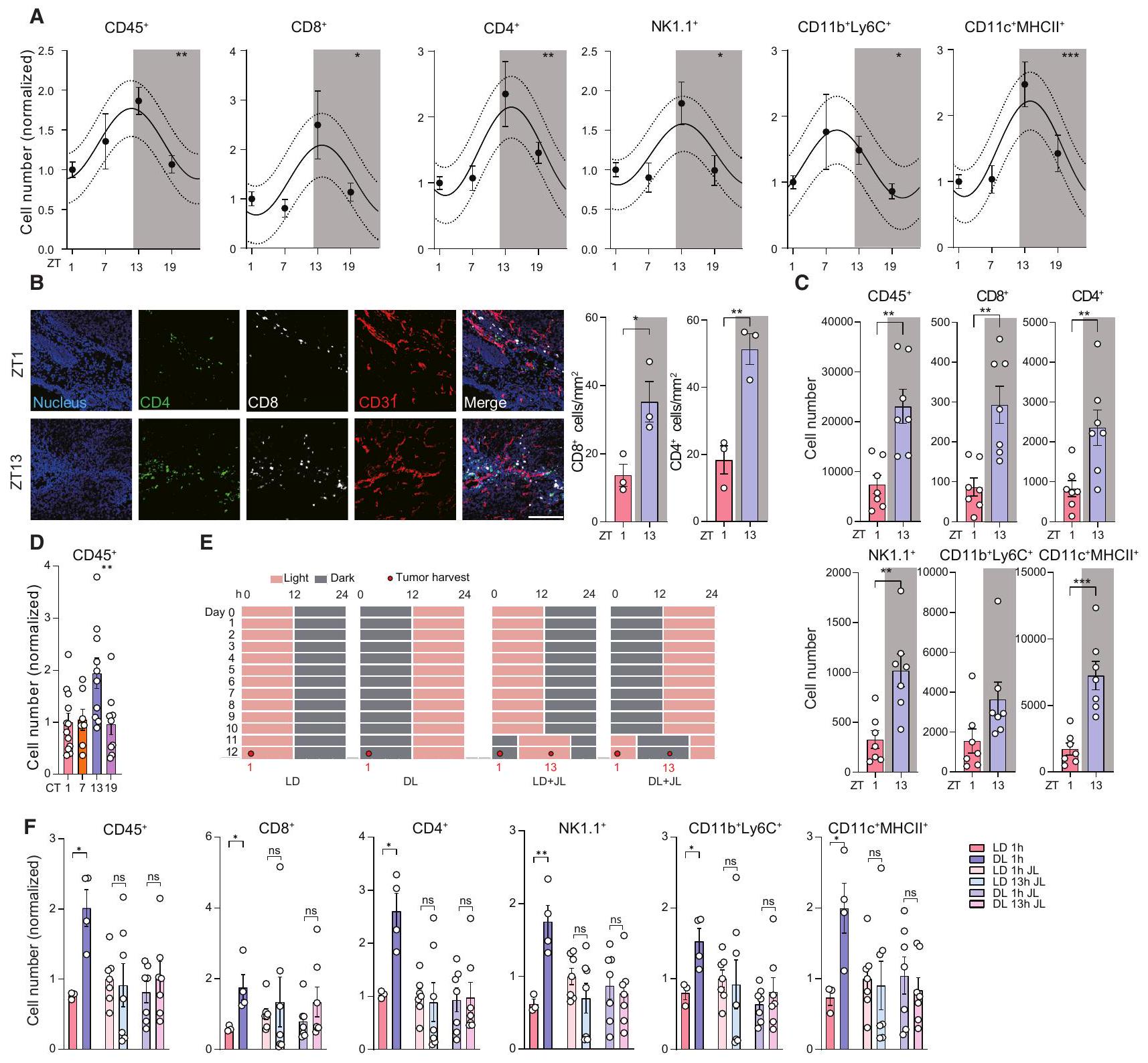 (F) أعداد الكريات البيضاء المتسللة إلى الورم في ورم B16-F10-OVA، التي تم جمعها في النقاط الزمنية المحددة (1 أو 13 ساعة في E) بعد بدء الدورة تحت الضوء: الظلام (LD،