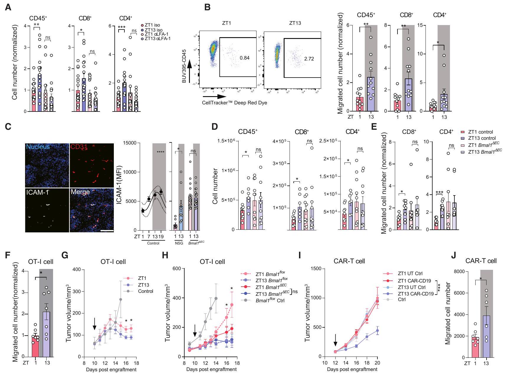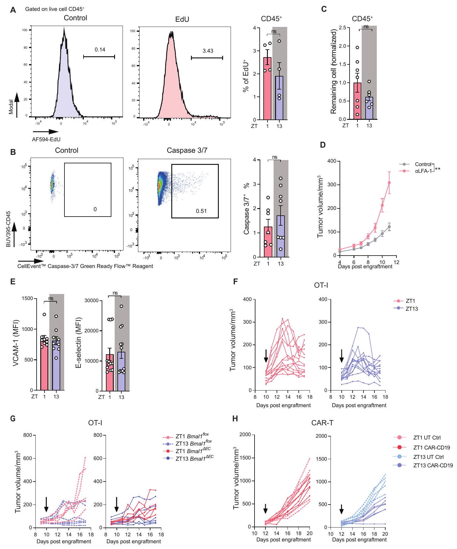 (أ) الأعداد الكلية المعيارية لكريات الدم البيضاء المتسللة إلى الورم في نموذج B16-F10-OVA، التي تم جمعها في ZT1 أو ZT13، بعد 24 ساعة من علاج الأجسام المضادة للتحكم في النمط أو الأجسام المضادة المضادة لـ LFA-1؛