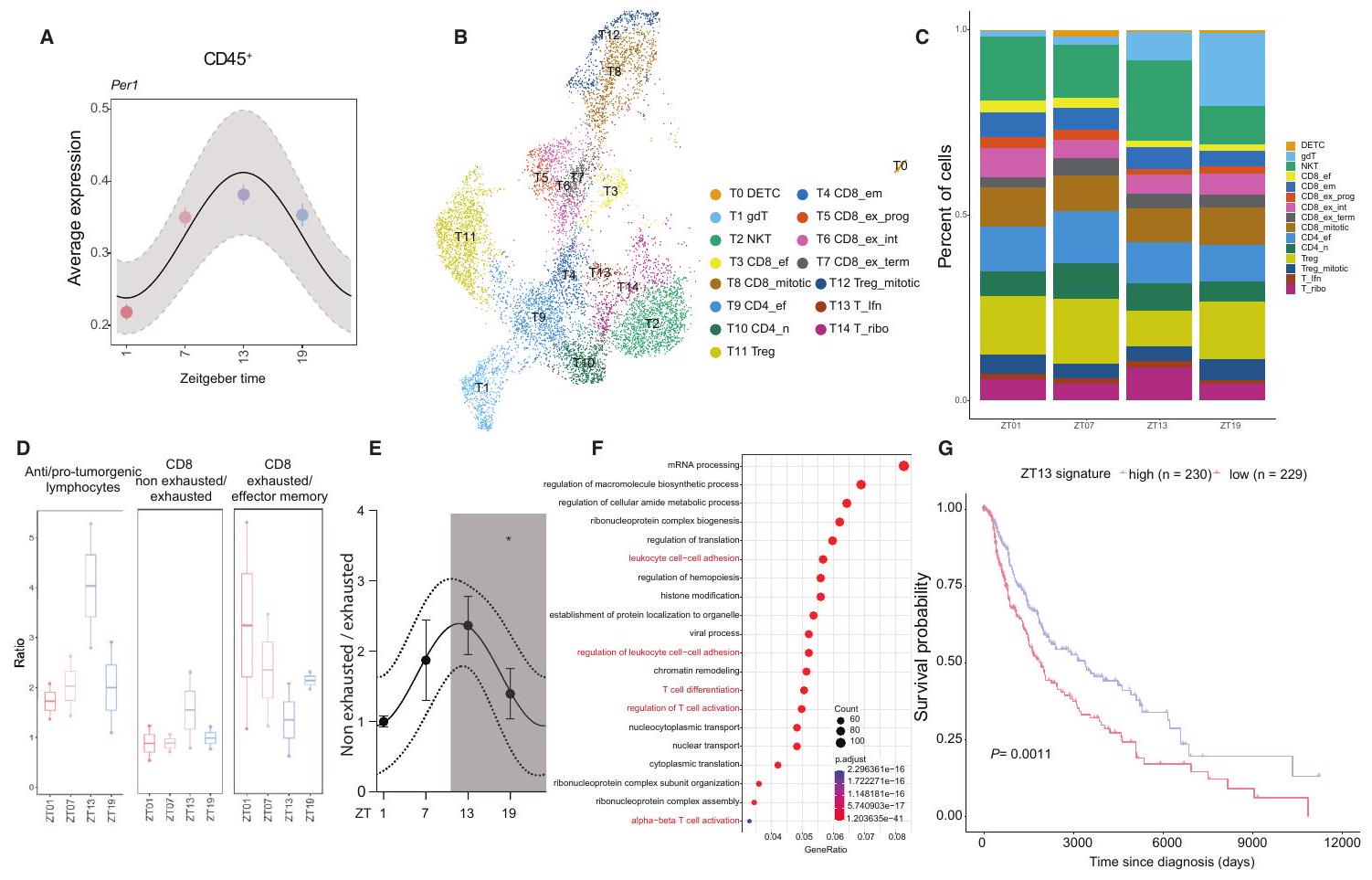 (د) نسبة وفرة مجموعات معينة من خلايا T في أوقات مختلفة من اليوم بواسطة تسلسل RNA أحادي الخلية. تشمل “الخلايا اللمفاوية المضادة للورم” خلايا NK،