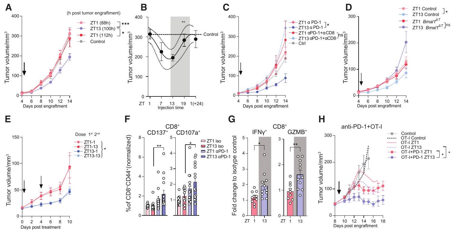 (B) Tumor volume after anti-PD-1 treatment administered at ZT1 or ZT13 in B16-F10-OVA tumors;